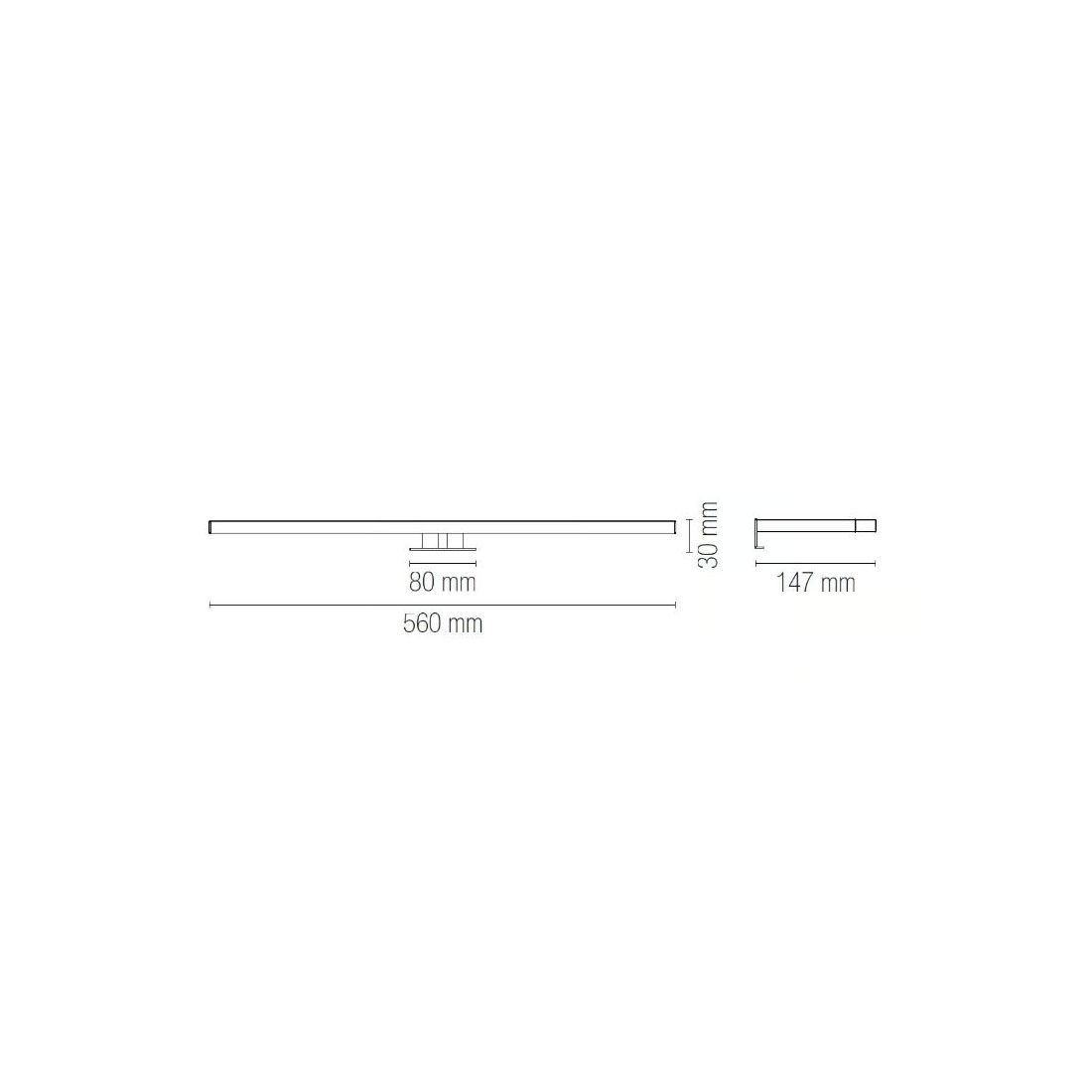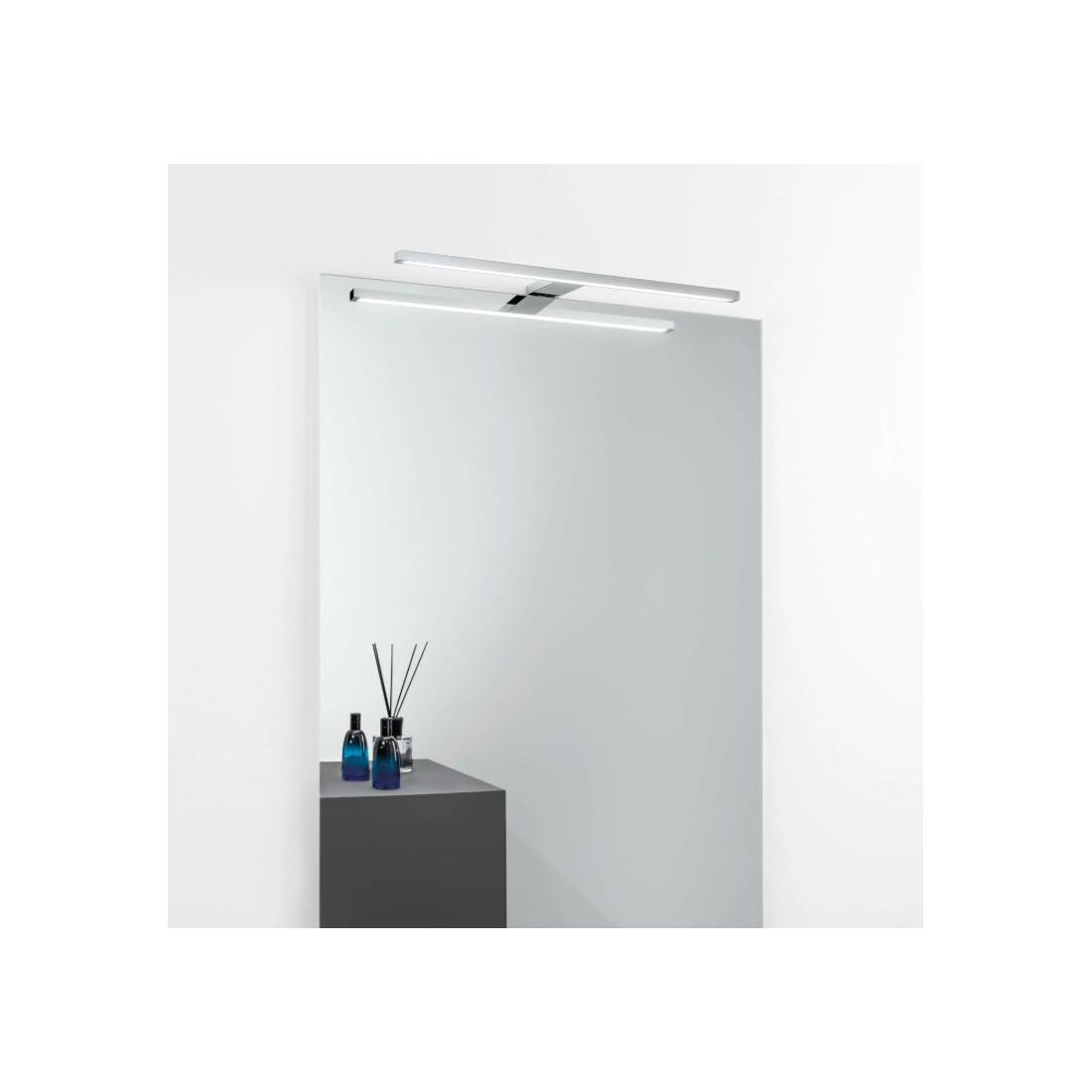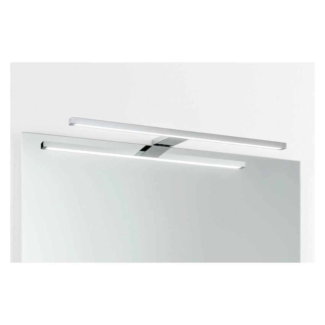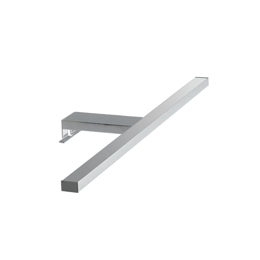 Lampada da parete con una lunghezza di cm 56 prodotta in termoplastica con finitura Cromo con diffusore in acrilico con luce led diretta verso il basso cosi che tutto il flusso luminoso possa illuminare in modo perfetto lo specchio da bagno oppure anche un piccolo armadio a muro o un quadro.