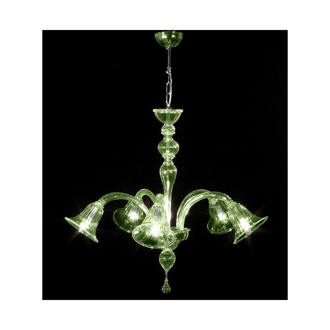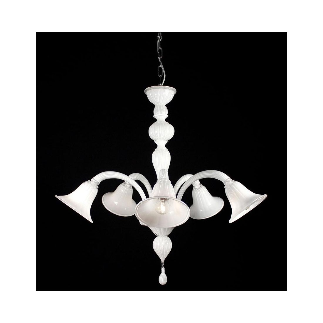 Lampadario a sospensione con 5 luci composto dai bracci arcuati in vetro di Murano lavorato a mano dai quali pendono i diffusori a campana che ospitano le sorgenti luminose; il corpo del lampadario è composto da elementi in vetro soffiato e viene prodotto in 4 diverse finiture colore, a vostra scelta, tra Verde, Arancio, Bianco e Fumè.