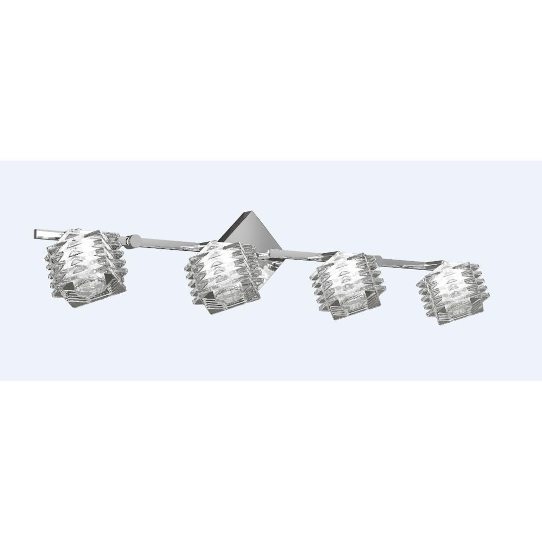 Applique/Spot a 4 luci, dal design moderno, che si presenta con una struttura in metallo cromato lucido e con 4 spot orientabili realizzati in cristallo trasparente che prendono la forma di cubi sfalsati che si ispirano al famoso cubo di Rubik.