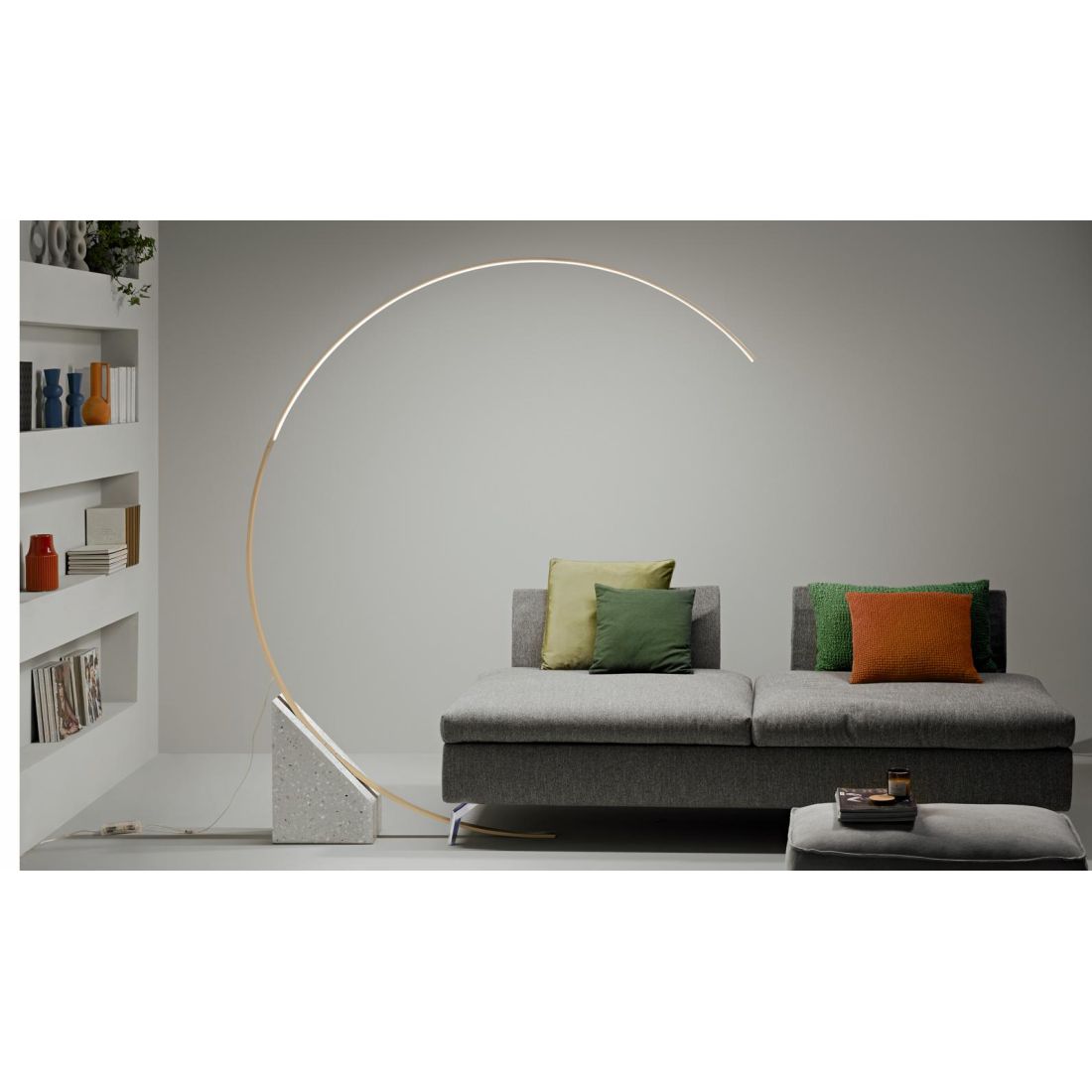 Piantana ad arco, con un design moderno, che si presenta con una struttura a mezza luna realizzata in metallo con finitura Nera oppure Oro (a vostra scelta).