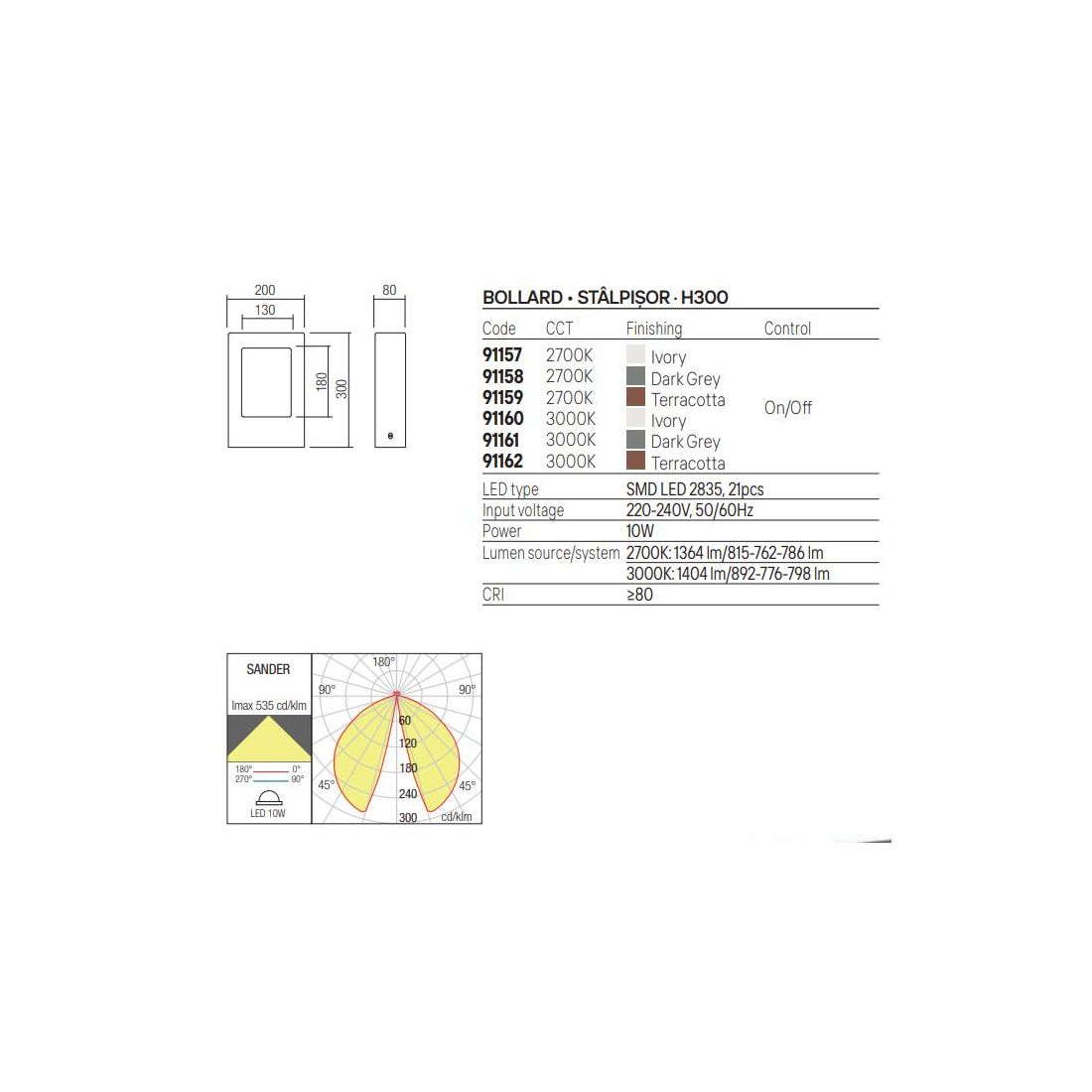 Sander integra una sorgente luminosa a Led da 10w con una luce calda 2700k oppure luce bianca calda 3000k (a vostra scelta) ed è particolarmente adatto per illuminare vialetti e sentieri pedonali, delimitare parcheggi, bordi stradali o marciapiedi, per mettere in risalto aiuole, zone verdi e giardini sia in contesti privati che in spazi aperti commerciali.