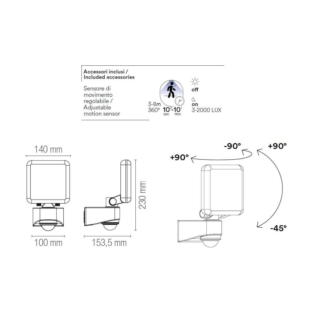 Il prodotto è dotato di sensore crepuscolare e di sensore di movimento che consentono l’accensione automatica al rilevamento di persone o veicoli e il funzionamento sincronizzato con il ciclo naturale della luce attivandola al tramonto e spegnendola automaticamente all'alba.