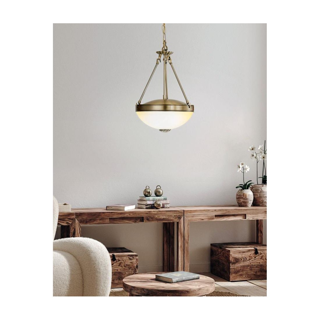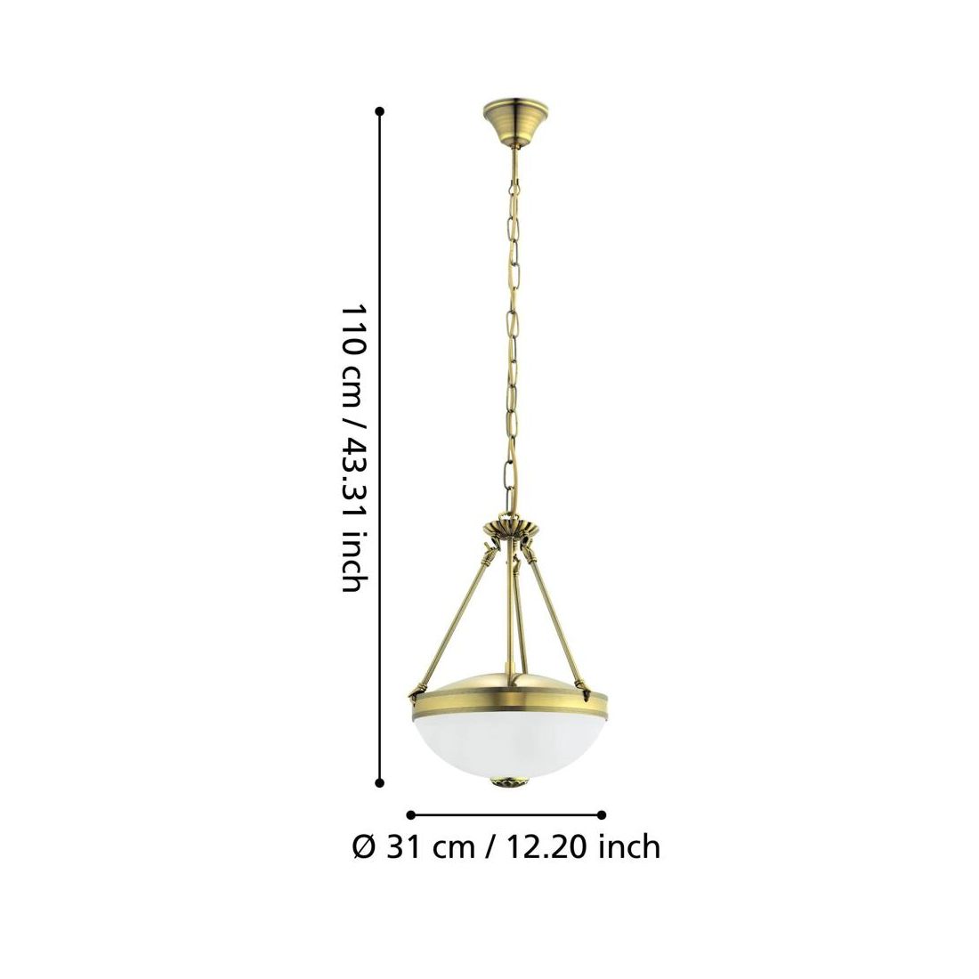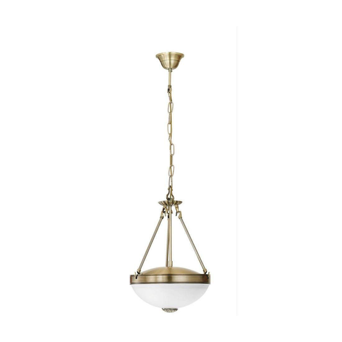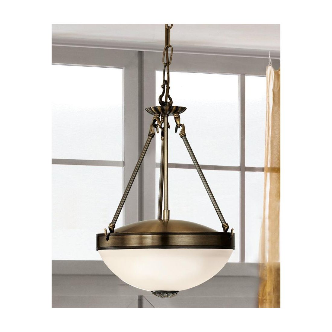 Sospensione singola dallo stile prettamente classico che si presenta con una struttura realizzata in metallo con finitura Brunito e con un paralume rotondo in vetro satinato bianco, che completa perfettamente il design classico. Grazie alla catena a maglie e ai dettagli decorativi bruniti, la lampada offre un'illuminazione speciale in salotto, cucina, camra da letto, nell'ingresso oppure nello studio.