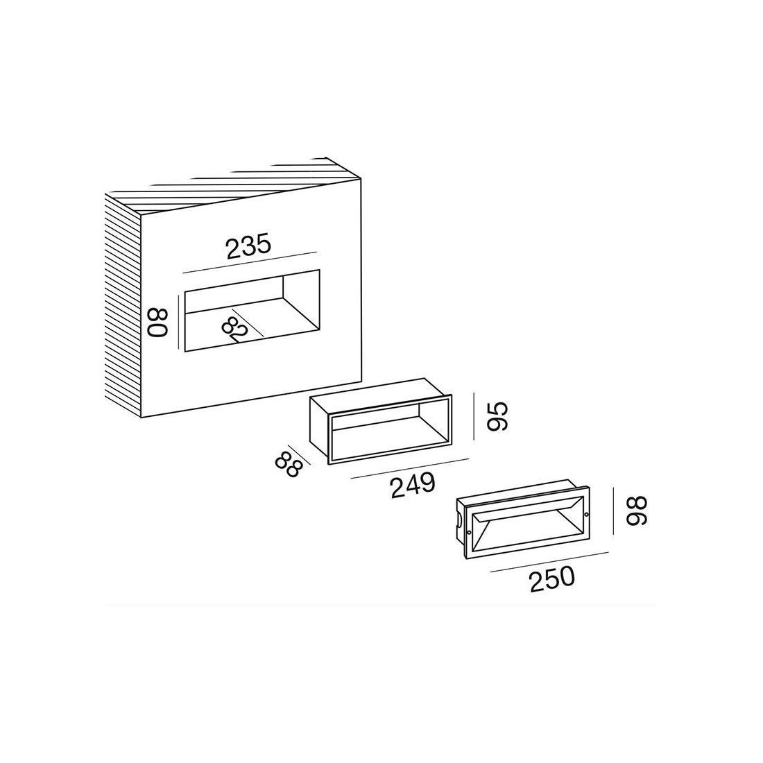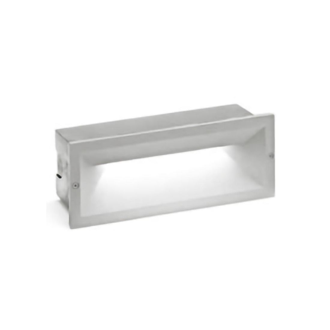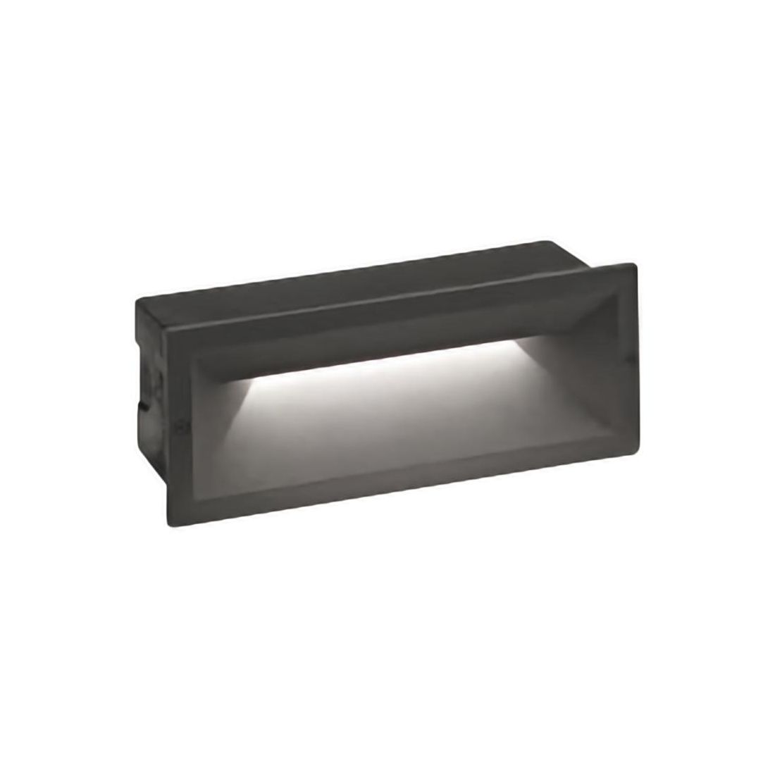 Segnapasso rettangolare in alluminio, per incasso a parete, per l'illuminazione di vialetti esterni o anche per illuminare le scale sia esterne che interne. La struttura in alluminio si può avere in due colori Antracite oppure Grigio metallizzato e il suo diffusore in policarbonato opale permette una luce diffusa ma rivolta tutta verso il basso.