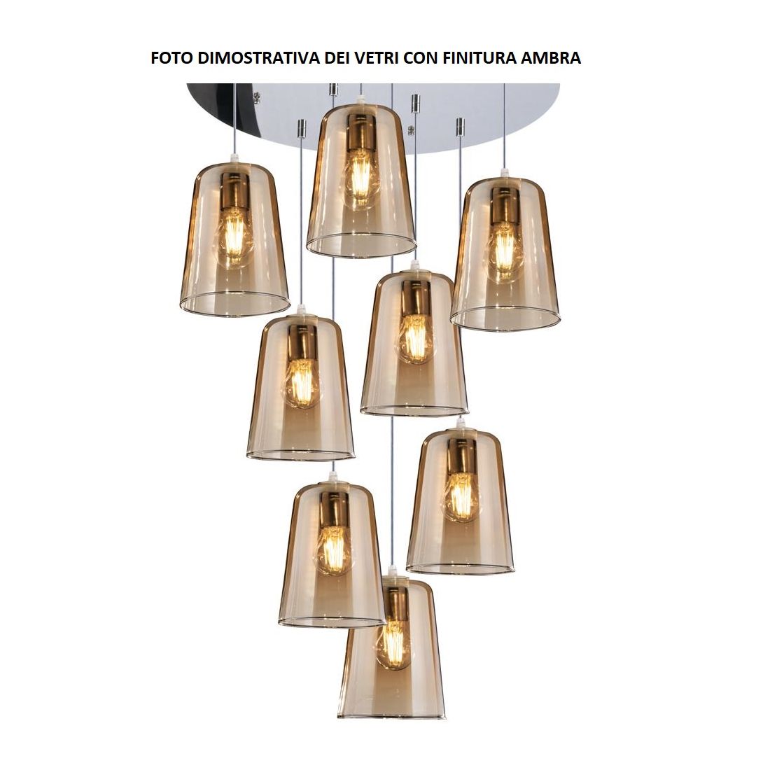 SHADED SOSPENSIONE 8 LUCI IN FINITURA OTTONE CON CONI IN VETRO AMBRA CROMO OPPURE RAME