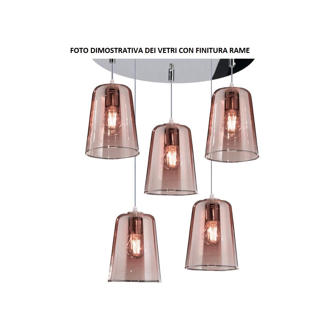 SHADED SOSPENSIONE 5 LUCI IN METALLO CROMATO CON CONI IN VETRO AMBRA CROMO OPPURE RAME