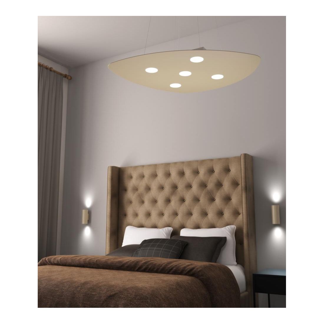 Lampadario a sospensione dal design moderno, del brand Top Light, che si presenta con una forma a scudo realizzato in metallo verniciato nelle finiture Sabbia, Bianco oppure Grigio (a vostra scelta) con 5 luci dirette verso il basso; realizzato su una lastra di metallo sottile sospeso dal soffitto grazie ai cavi metallici regolabili in altezza.