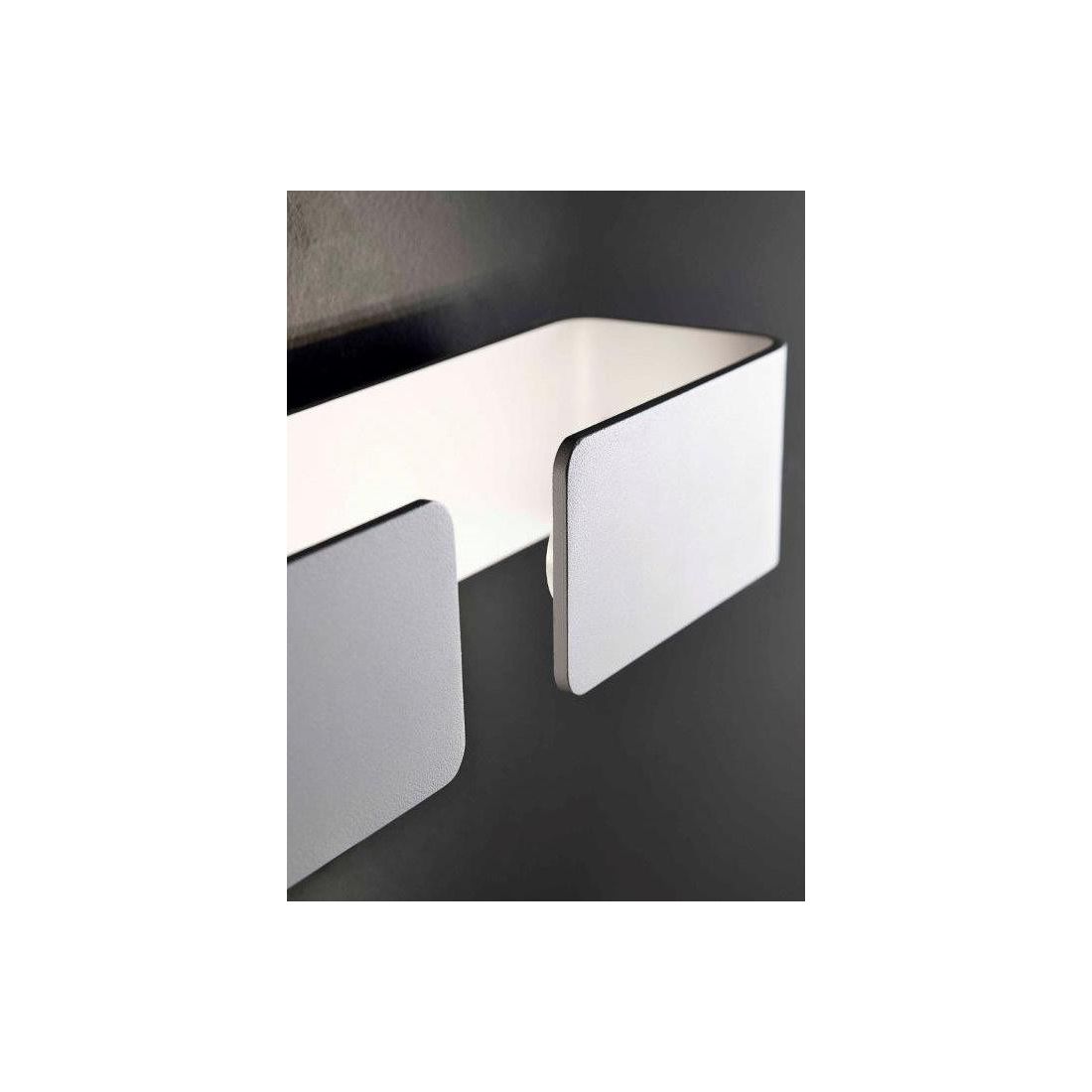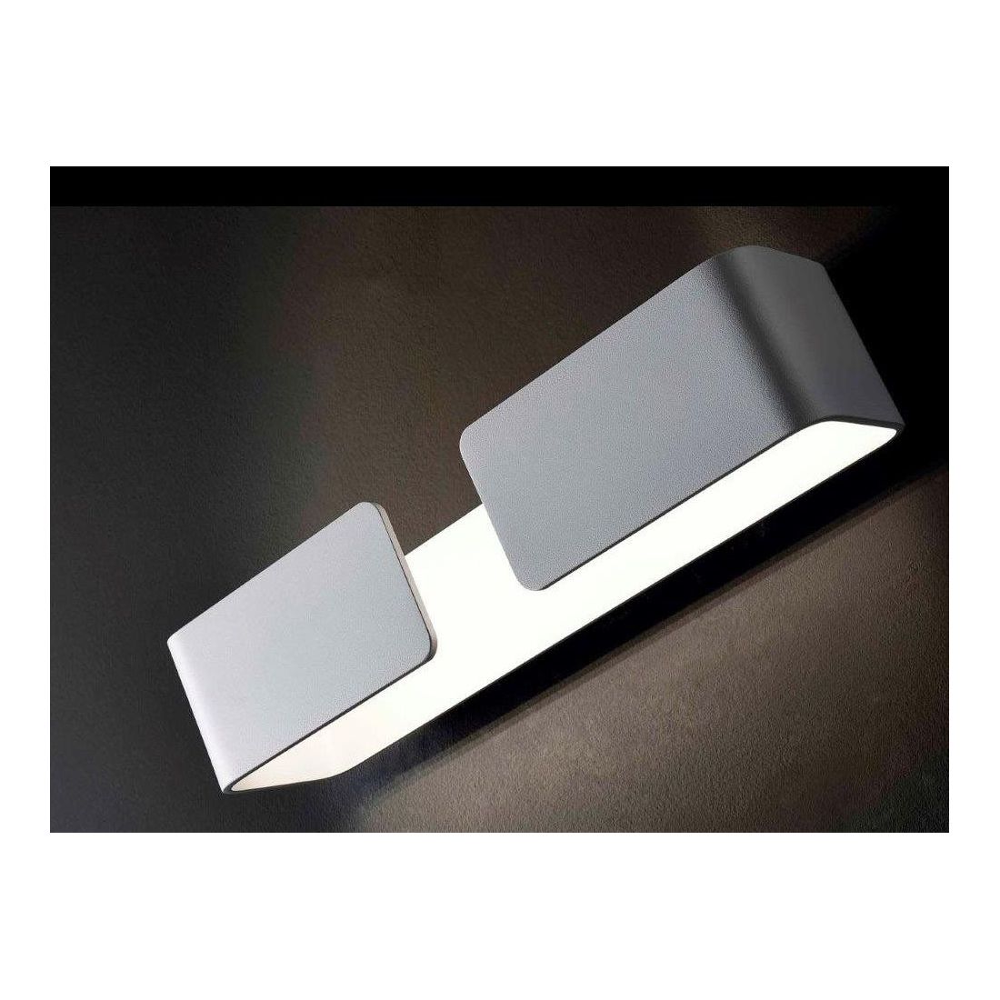 Applique moderna che si ispira alle linee di una grande firma interamente realizzata in alluminio verniciato bianco, curvato sui due lati e lasciato aperto sia nella parte inferiore che nella parte superiore per una migliore diffusione della luce sia verso l'alto che verso il basso; questo ne consente anche un migliore accesso per la pulizia e per la sostituzione delle lampadine.