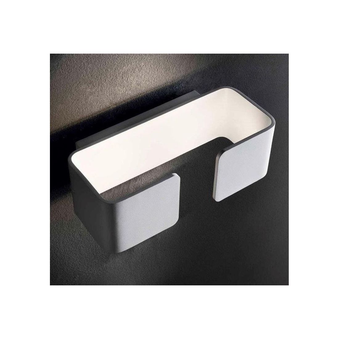 Applique moderna che si ispira alle linee di una grande firma interamente realizzata in alluminio verniciato bianco, curvato sui due lati e lasciato aperto sia nella parte inferiore che nella parte superiore per una migliore diffusione della luce sia verso l'alto che verso il basso; questo ne consente anche un migliore accesso per la pulizia e per la sostituzione delle lampadine.