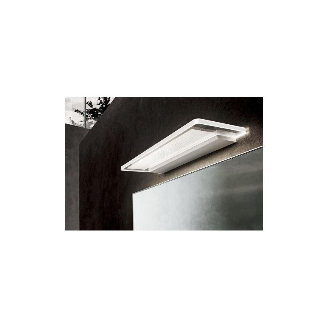 Applique Skinny di Linea Light da 70 cm di larghezza con luce diffusa verso l'alto e verso il basso, grazie al suo diffusore in policarbonato trasparente con serigrafia bianca a nido di ape che gli permette al flusso luminoso di diffondersi nella stanza senza dare fastidio agli occhi.