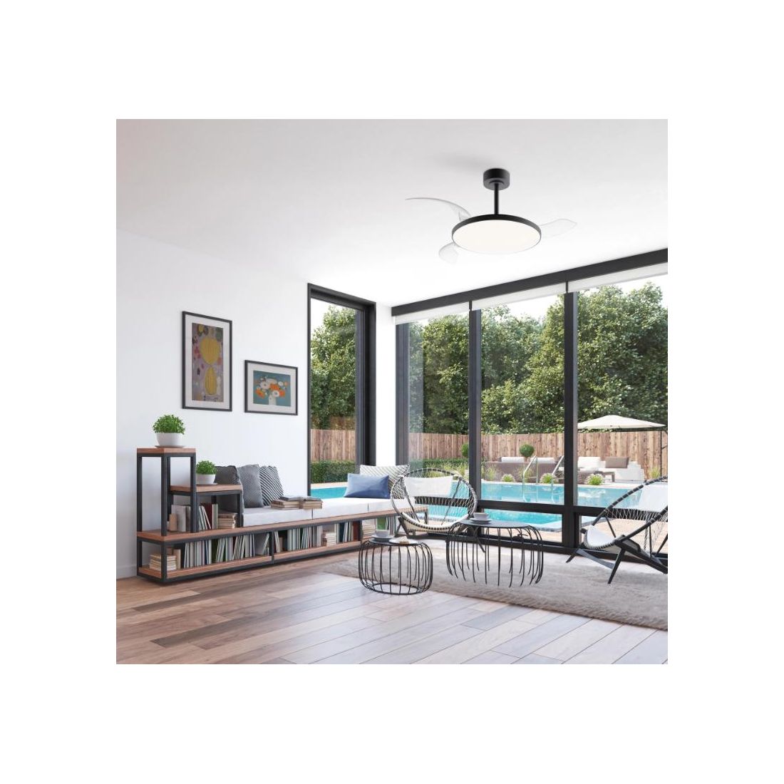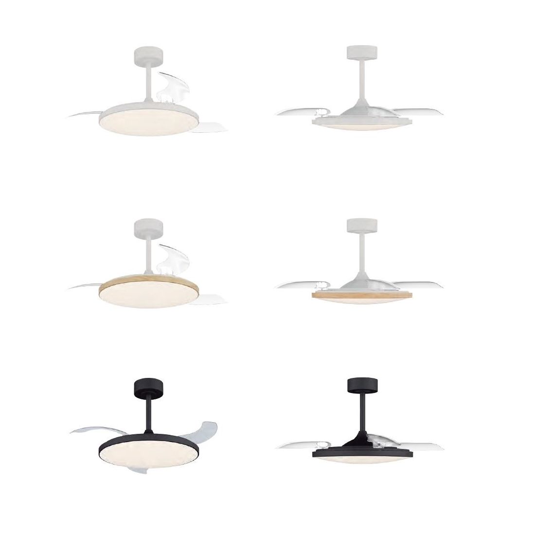 Ventilatore che si distingue per il suo stile contemporaneo e funzionale e che si presenta con una struttura realizzata in metallo verniciato disponibile in tre eleganti combinazioni di colore: Bianco con effetto legno, tutto Bianco oppure tutto Nero con pale trasparenti in acrilico motorizzate che si aprono automaticamente all'accensione e si richiudono al termine dell’utilizzo garantendo un’estetica minimale e una maggiore facilità di pulizia riducendo l'accumulo di polvere nel tempo.