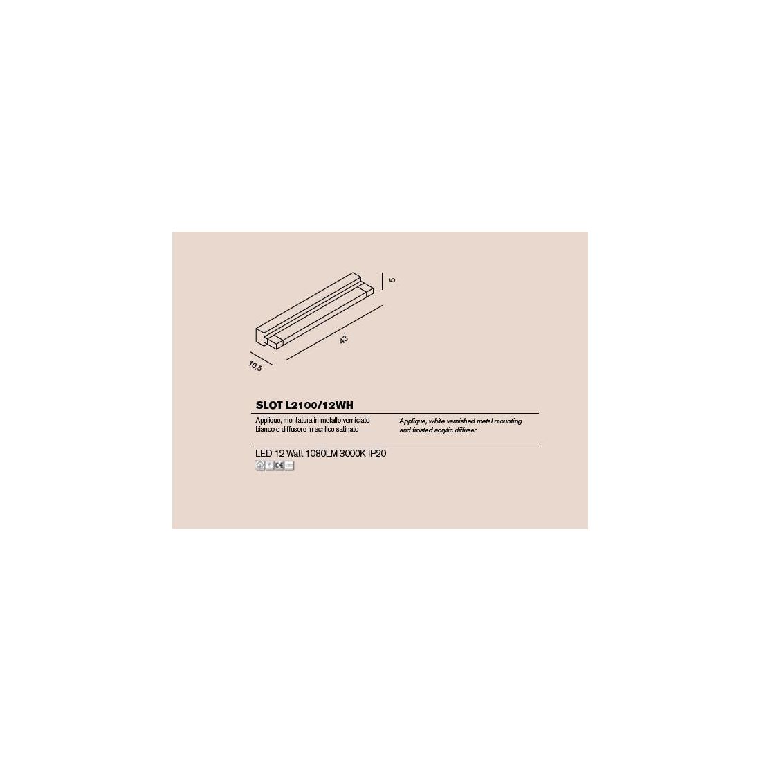 Slot un applique da parete a luce led integrata diffusa che si può montare in orizzontale ma anche in verticale come illumiazione laterale di uno specchio. Grazie alla posizione del led rivolto in avanti e coperto dal diffusore in acrilico satinato si sprigiona il flusso luminoso in avanti con un angolo di 120° senza dare fastidio agli occhi.