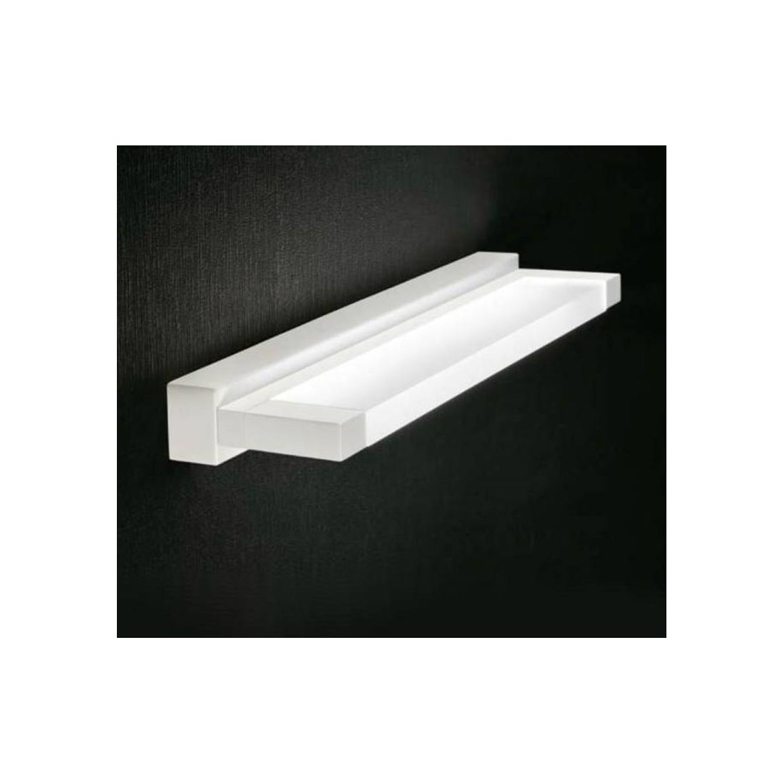 La montatura in metallo verniciato di bianco racchiude il driver nella parte che appoggia alla parete e la strip Led nascosta dietro l'acrilico satinato da 12w di consumo 1080 lumen di resa con luce bianco caldo 3000k.