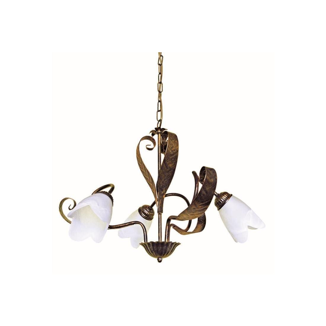 Lampadario a sospensione classico con un 3 punti luce con una struttura, dalle linee sinuose e avvolgenti, impreziosita da dettagli decorativi a fiori e foglie, il tutto reallizzato in metallo verniciato nel colore marrone con spennellature oro, lavorato a mano in Italia. I 3 paralumi prendono la forma di una calla e sono realizzati in vetro opaco con decoro alabastro bianco con i bordi smerigliati che li rendono sofisticati e risaltano il contrasto con il colore della struttura.