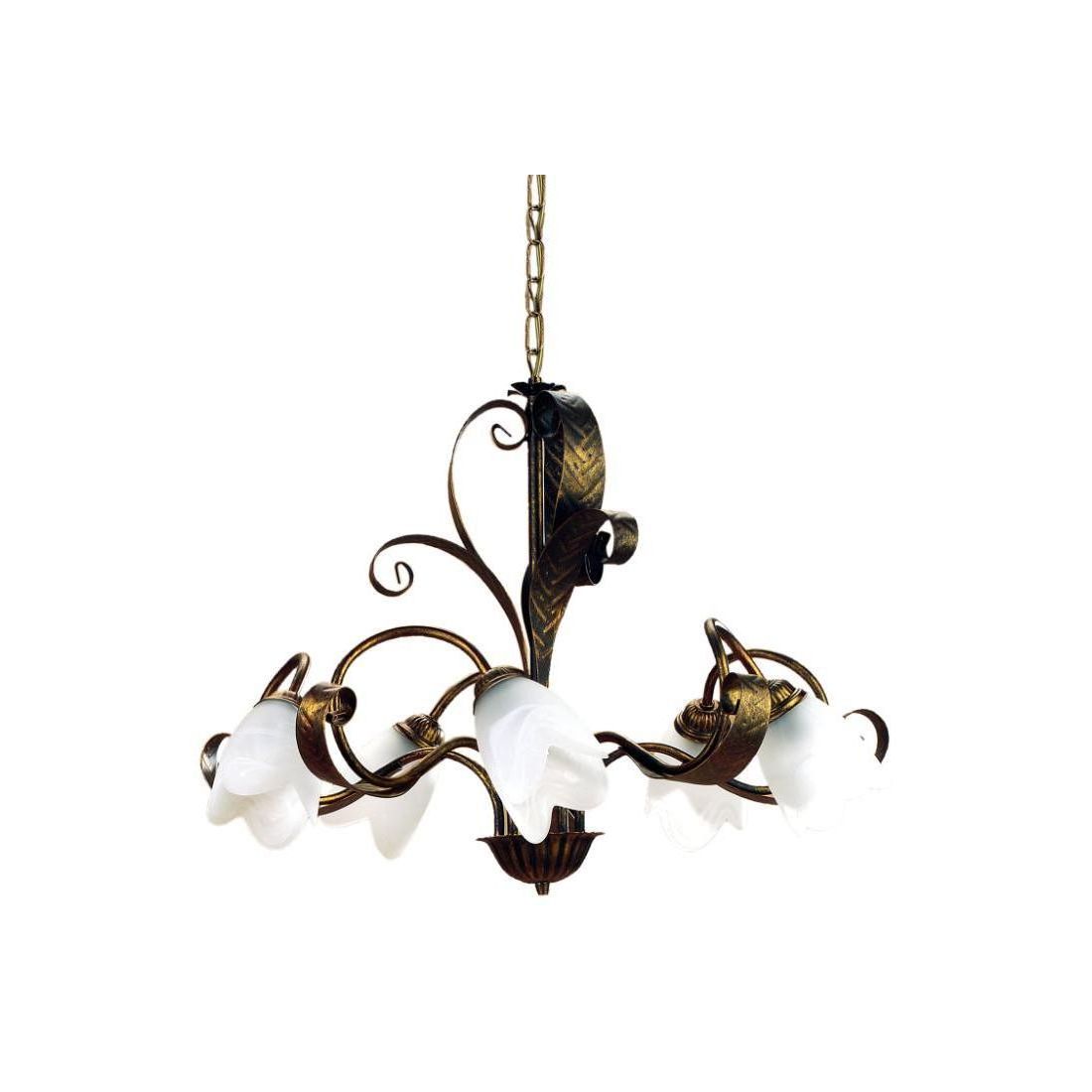 Lampadario a sospensione classico con un 5 punti luce con una struttura, dalle linee sinuose e avvolgenti, impreziosita da dettagli decorativi a fiori e foglie, il tutto reallizzato in metallo verniciato nel colore marrone con spennellature oro, lavorato a mano in Italia. I 5 paralumi prendono la forma di una calla e sono realizzati in vetro opaco con decoro alabastro bianco con i bordi smerigliati che li rendono sofisticati e risaltano il contrasto con il colore della struttura.