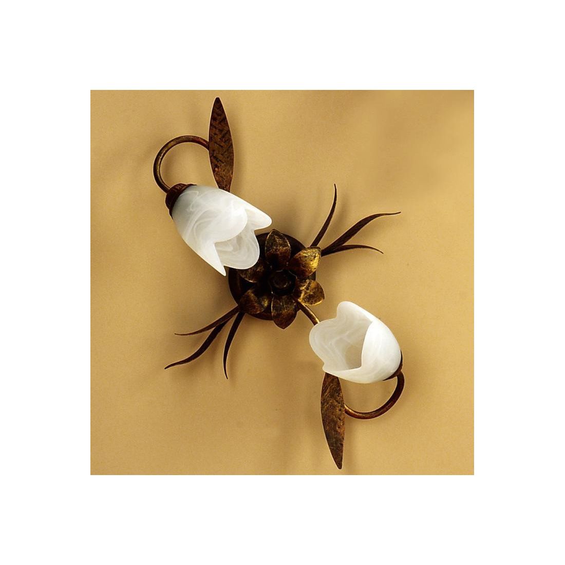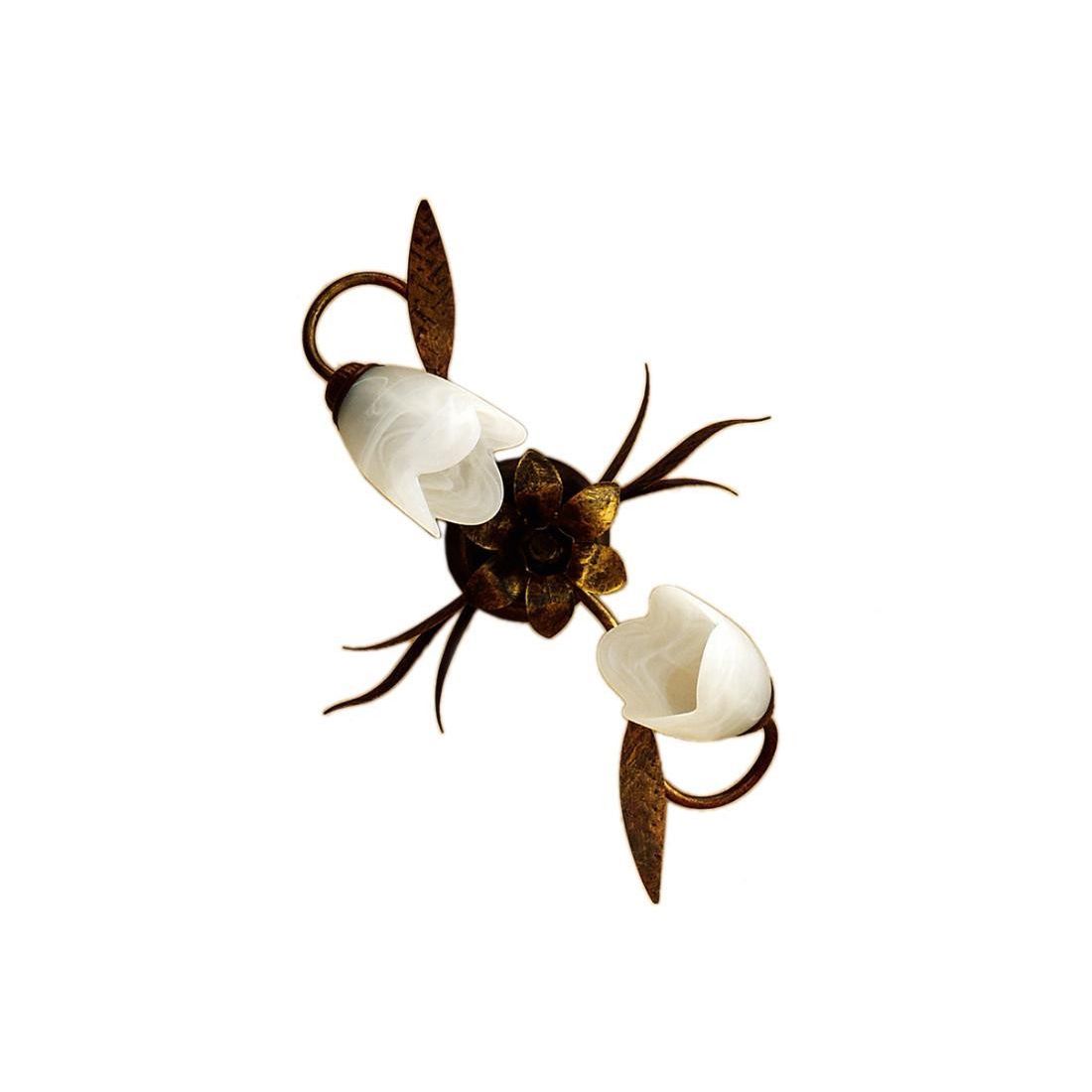 Lampada da soffitto o da parete dallo stile classico con un 2 punti luce, rivolto l'uno verso l'altro, con una struttura, dalle linee sinuose e avvolgenti, impreziosita da dettagli decorativi a fiori e foglie, il tutto reallizzato in metallo verniciato nel colore marrone con spennellature oro, lavorato a mano in Italia. I 2 paralumi prendono la forma di una calla e sono realizzati in vetro opaco con decoro alabastro bianco con i bordi smerigliati che li rendono sofisticati e risaltano il contrasto con il colore della struttura.