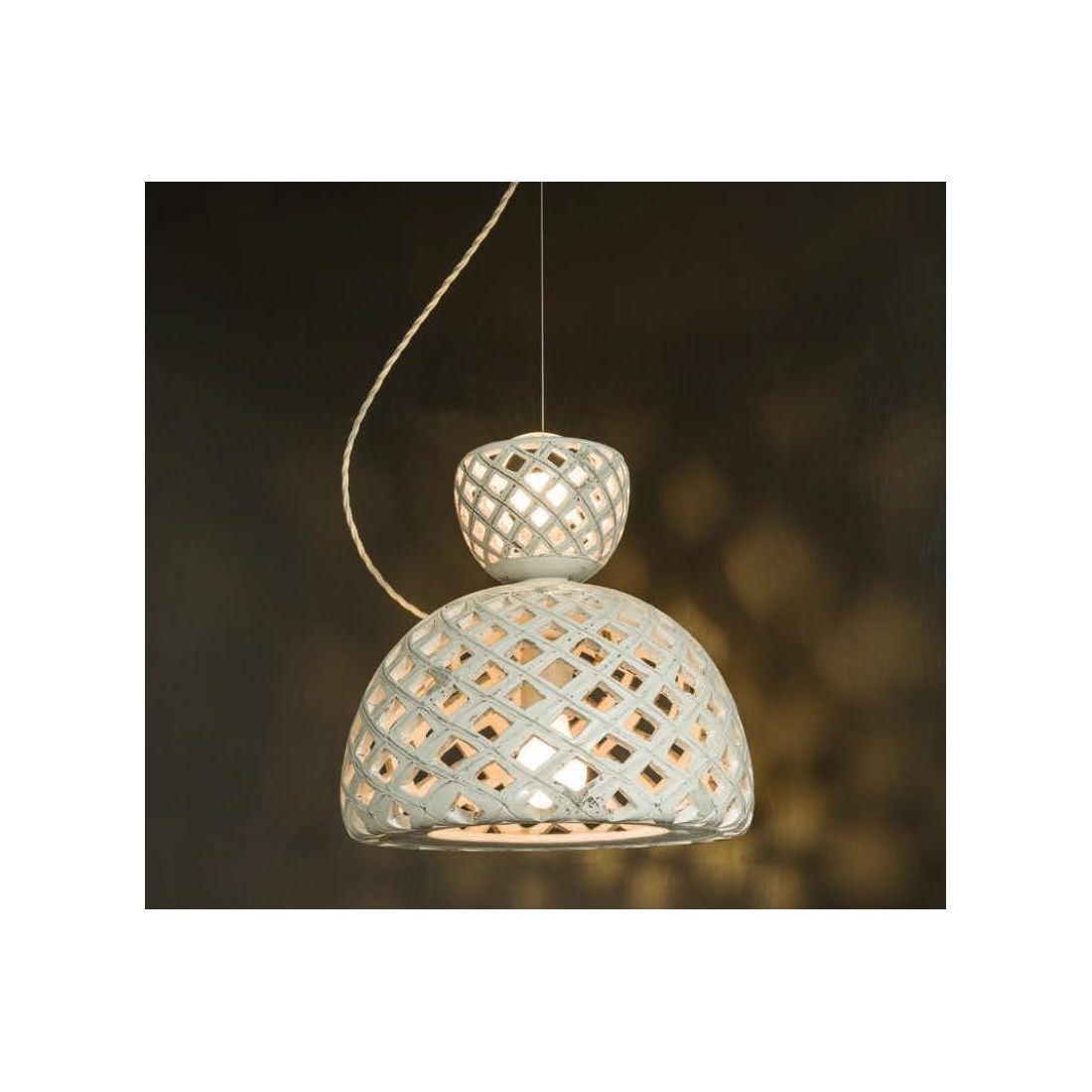 Lampadario a sospensione, con una forma originale e particolare, composto da due paralumi a campana, uno dalla misura più grande che emette la luce verso il basso e uno dalla misura più piccola che emette una luce indiretta verso l'alto, sovrapposti l'uno sull'altro; entrambi sono interamente realizzati in ceramica intagliata nel colore Bianco Sabbia con cavo elettrico a treccia di seta e cavetto in acciaio regolabile in altezza.