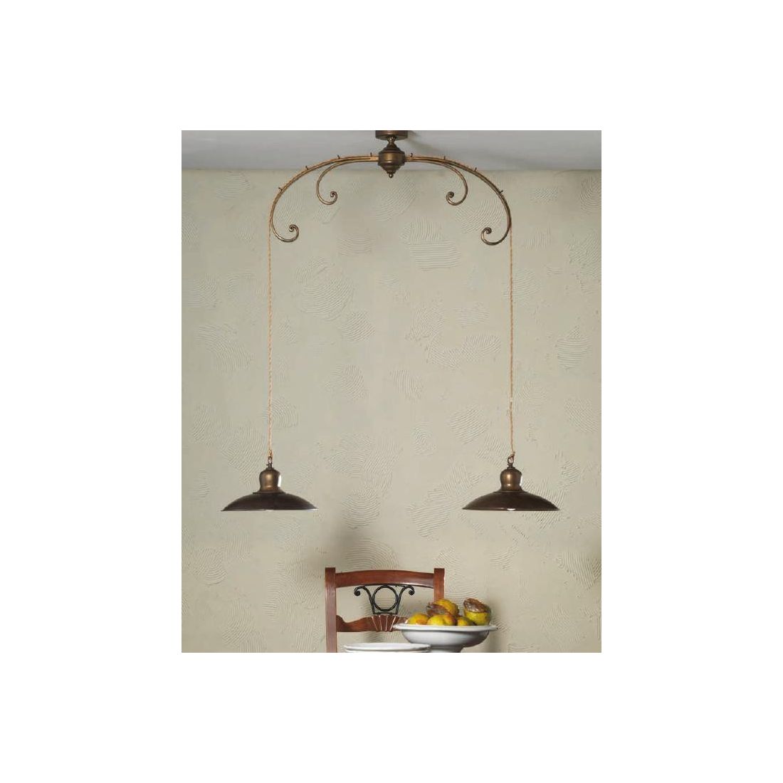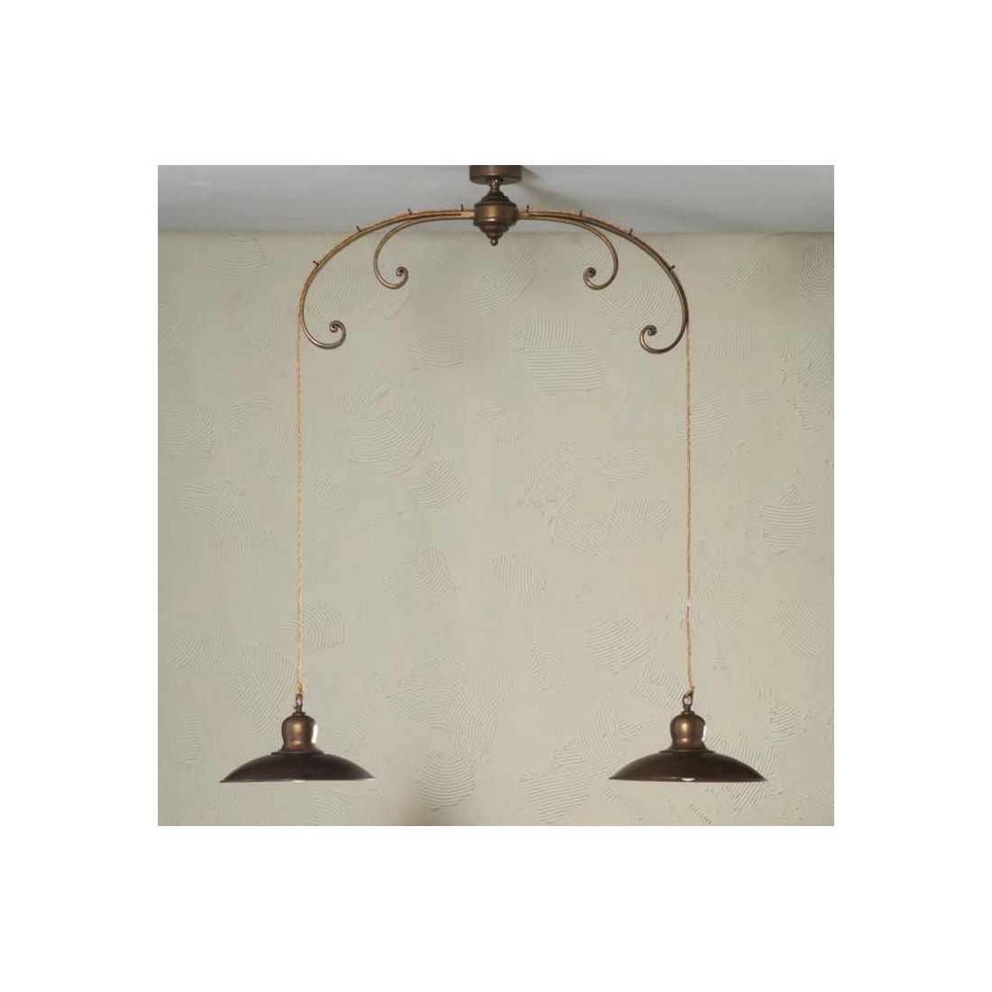 Lampadario, con attacco a plafoniera, con 2 luci, con una struttura ad arco, con riccioli decorativi, realizzata in ferro battuto, forgiato a mano, verniciato ottone da dove pendono i due diffusori a piatto, sorretti dal cavo a treccia di seta, prodotti in ottone invecchiato.