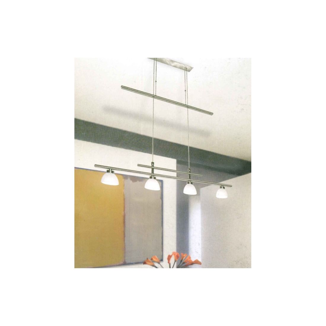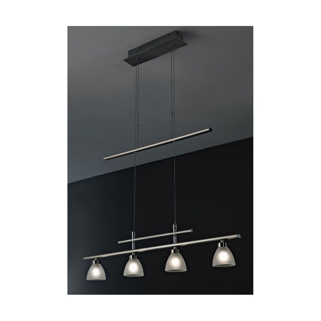 Lampadario a sospensione con un design moderno che si presenta con una base rettangolare a soffitto e con struttura in metallo con finitura Nickel spazzolato e con 4 diffusori pendenti in vetro bianco satinato con una barra lineare, appesa ai cavi di sospensione, che funge da contrappeso saliscendi utile a regolare l'altezza dei diffusori.