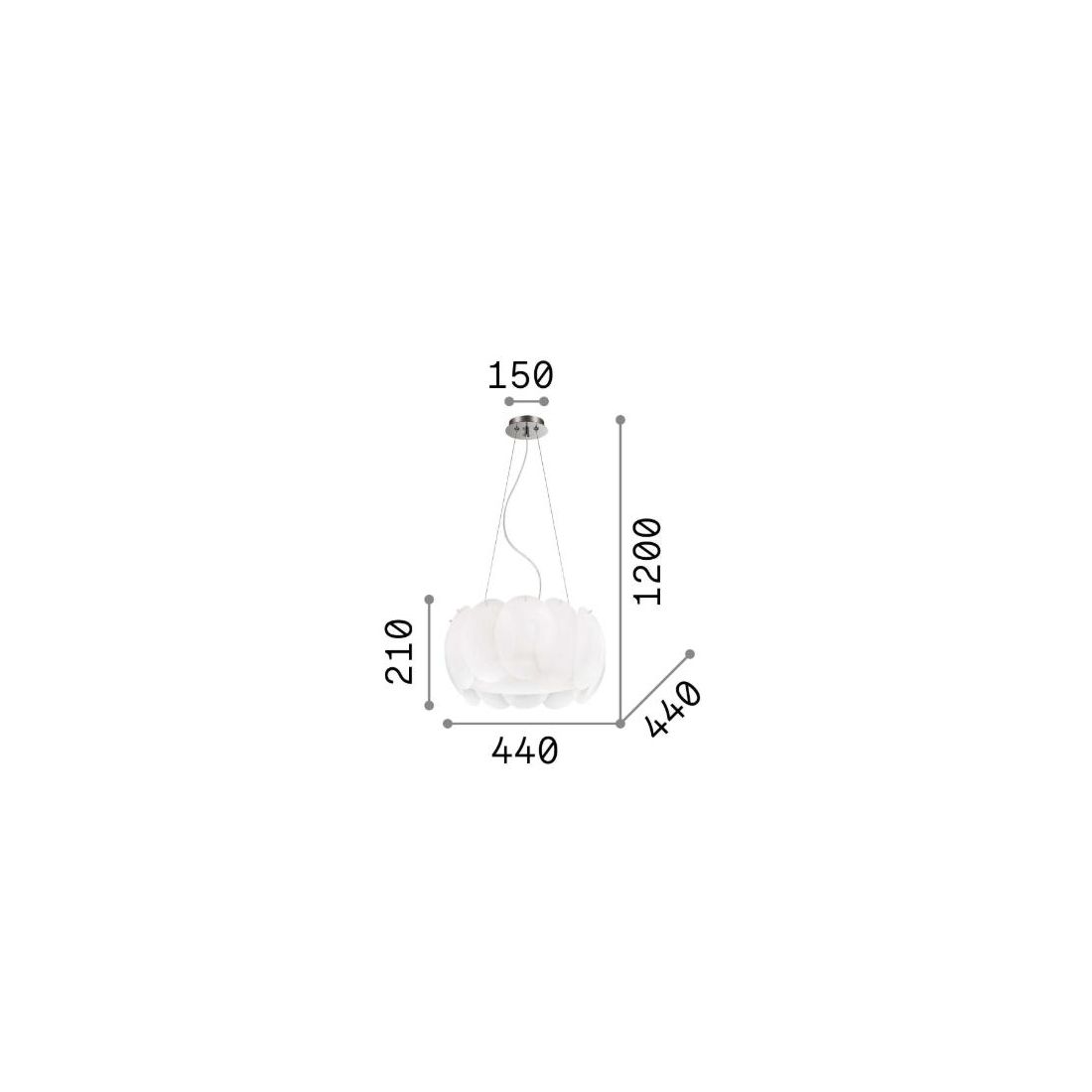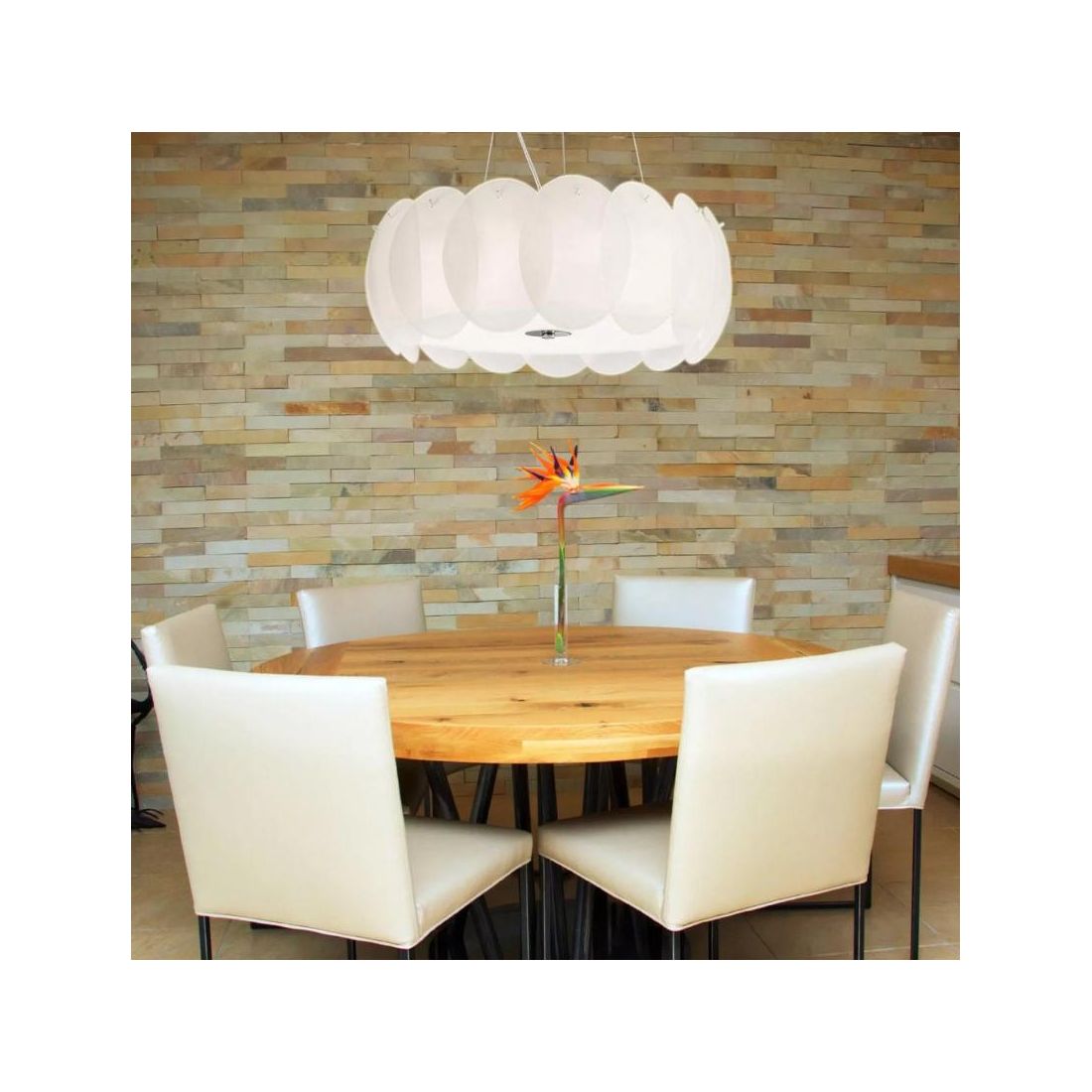 Lampadario a sospensione dal design moderno composta da una montatura in metallo con una finitura Cromo e dal diffusore, di forma ovale, composto da elementi circolari in lastra di vetro bianco, curvata e acidata. E' dotato di cavetti in acciaio regolabili in lunghezza, tramite dispositivi ferma cavo automatici, in modo da regolare l'altezza del punto luce come più vi necessita.