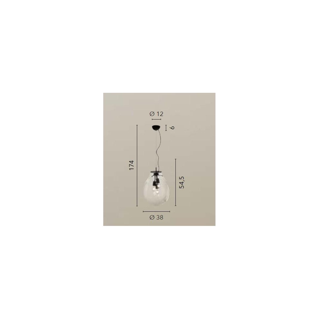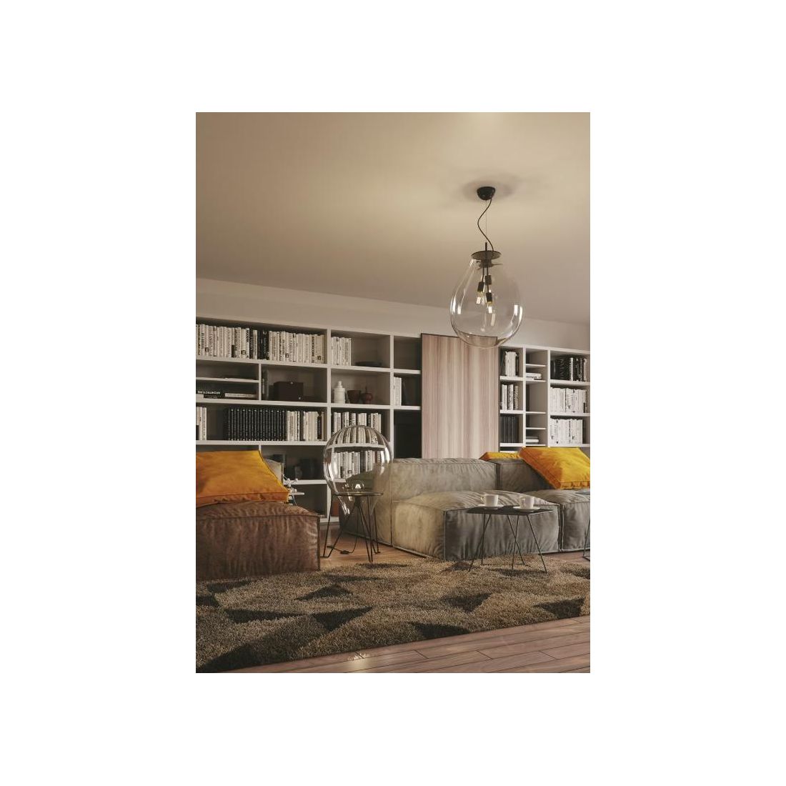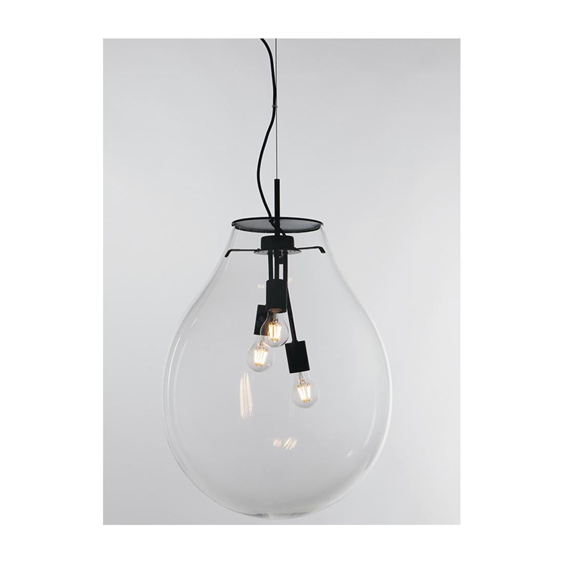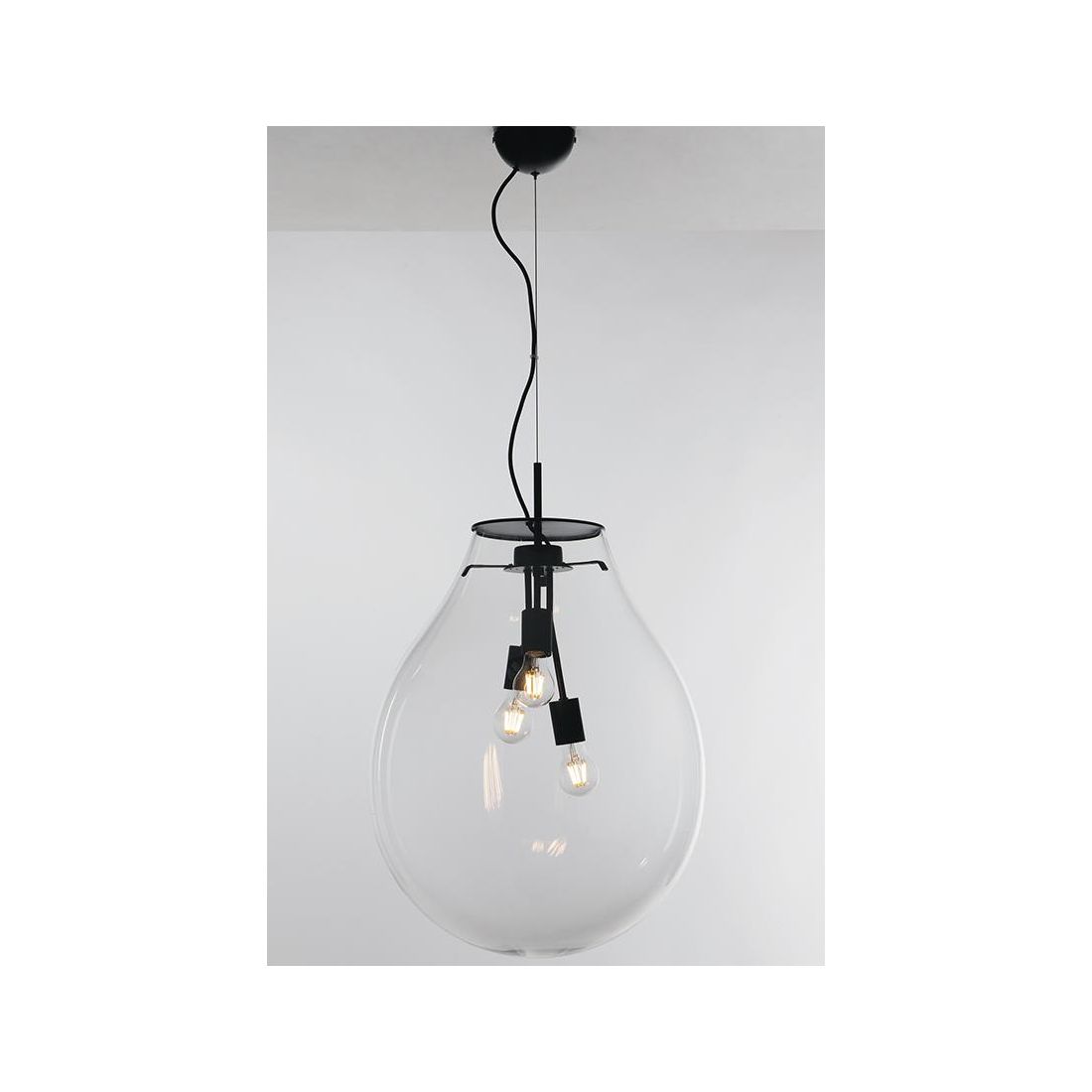 Sospensione singola dal design contemporaneo realizzata con una struttura in metallo di colore Nero e un ampio diffusore a forma di goccia, che evoca con stile la silhouette di una lampadina tradizionale, in vetro soffiato trasparente che garantisce una diffusione luminosa uniforme.
