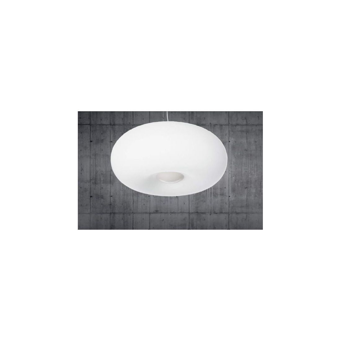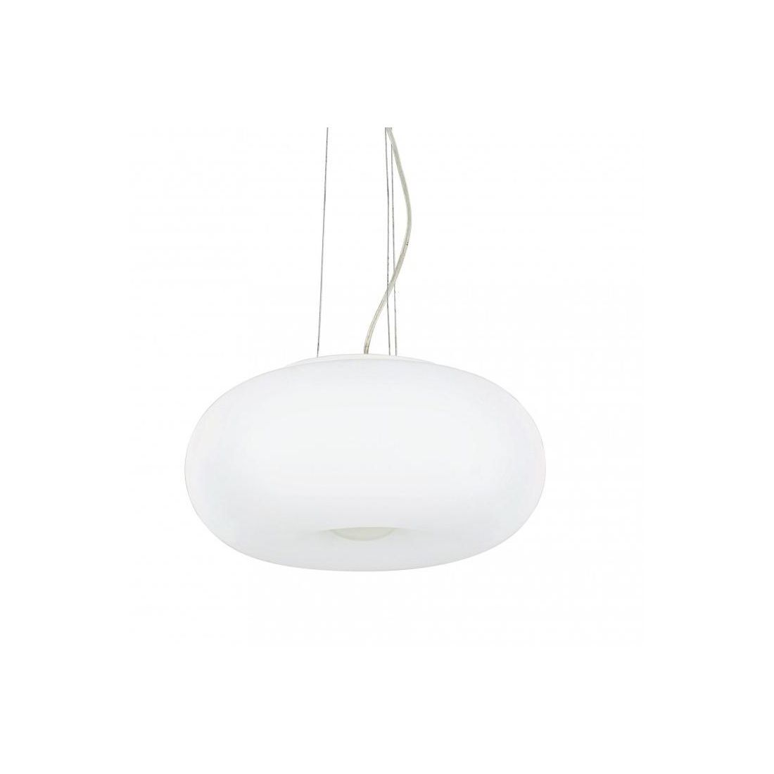 Lampadario a sospensione dal design moderno composta da una montatura in metallo con una finitura bianca e dal diffusore, di forma rotonda, realizzato in vetro bianco soffiato e acidato; è dotata di cavetti in acciaio regolabili in lunghezza, tramite dispositivi ferma cavo automatici, in modo da regolare l'altezza del punto luce come più vi necessita.