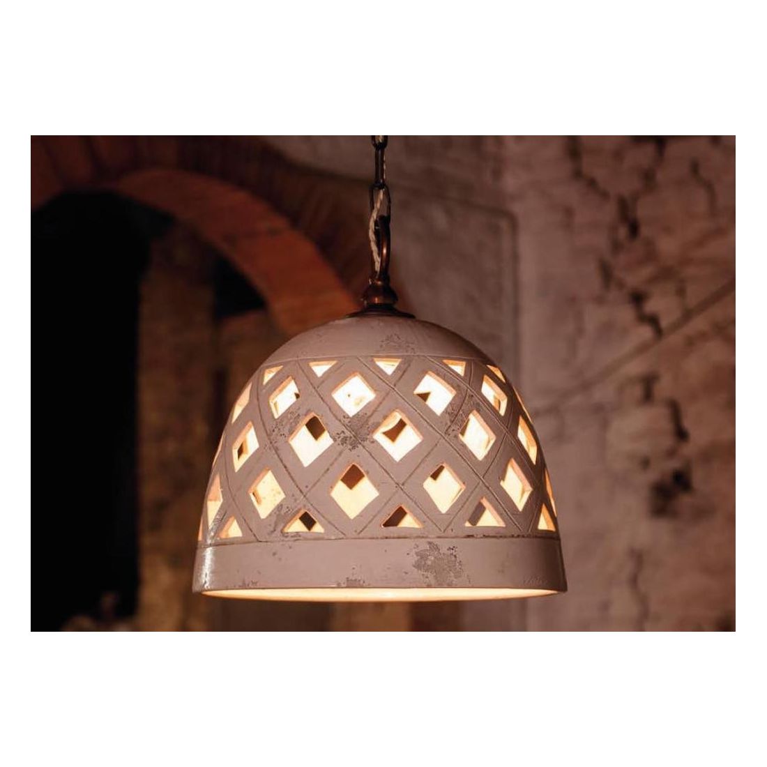 Lampadario a sospensione in stile rustico, dalla forma a campana, interamente realizzato in ceramica Bianco Sabbia, decorata a mano, con il paralume intagliato a rombi che al momento dell'accensione crea bellissimi giochi di luce e una luce diffusa nella stanza; dotato di catena in metallo e cavo a treccia di seta intonato con il colore del lampadario.