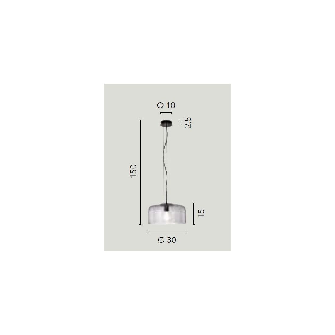 Sospensione singola che si presenta con una montatura realizzata in metallo e con un diffusore, a forma di campana, in vetro soffiato lucido disponibile nei colori Bianco, Ambra, Blu, Trasparente oppure Grigio. Il diffusore in vetro è disponibile in tre diverse misure: diametro cm 30 - cm 35 o cm 40 e si adatta perfettamente a spazi di varie dimensioni.