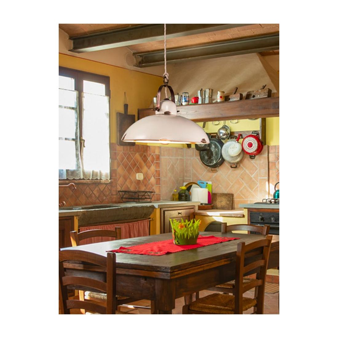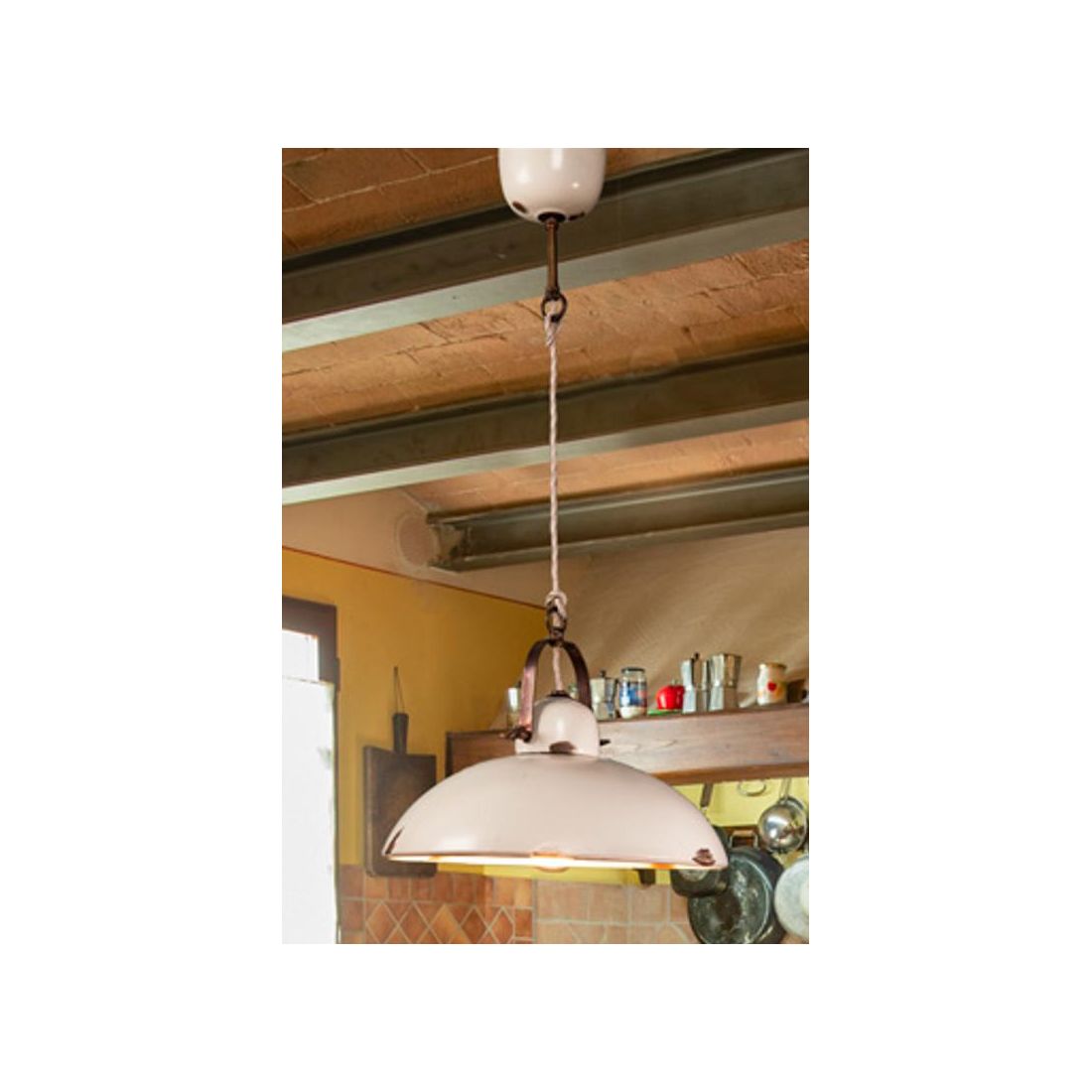 Sospensione singola in stile rustico, con un diametro di cm 30, realizzata in ceramica con decoro Bianco pepe con dettagli e snodo sopra il piatto realizzati in Ottone anticato, ideale per l'illuminazione di salotti, cucine, taverne oppure per lo studio.