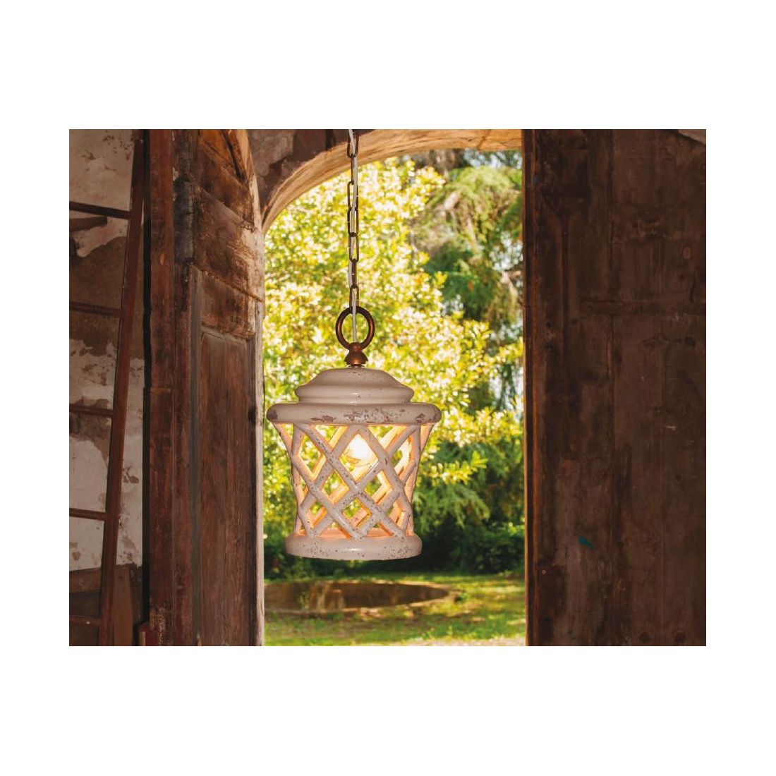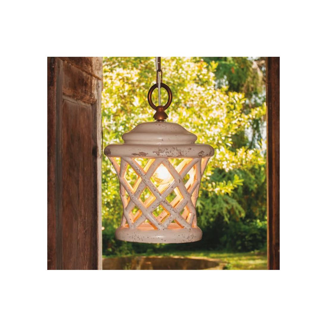 Sospensione singola, in stile rustico, adatta anche ad ambienti esterni, con diffusore a lanterna realizzato in ceramica bianca smaltata intagliata e decorata a mano in Italia con decoro Bianco Sabbia corredato di catena in ottone invecchiato che si può accorciare o allungare a seconda dell'altezza che volete dare al punto luce.