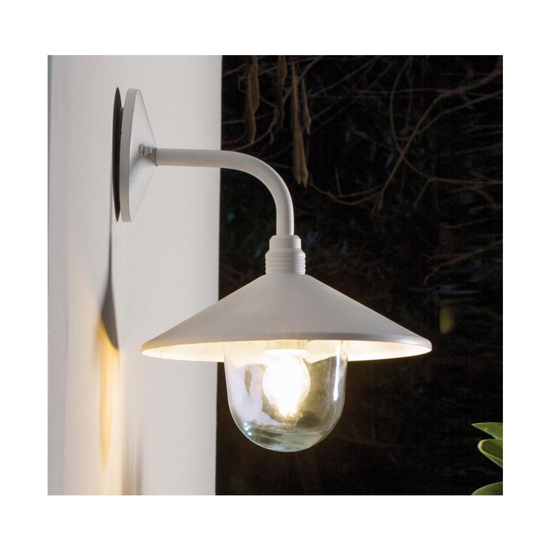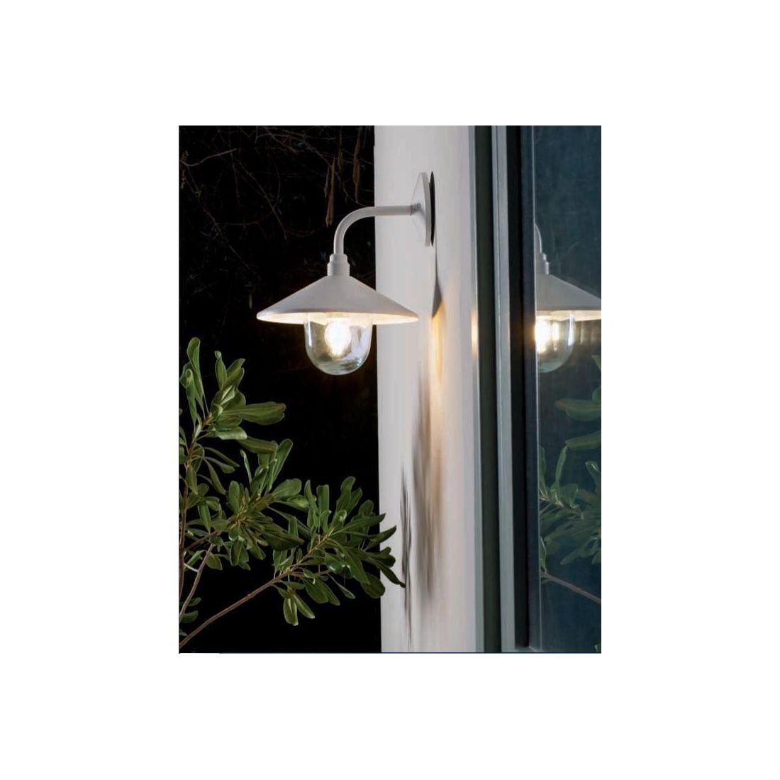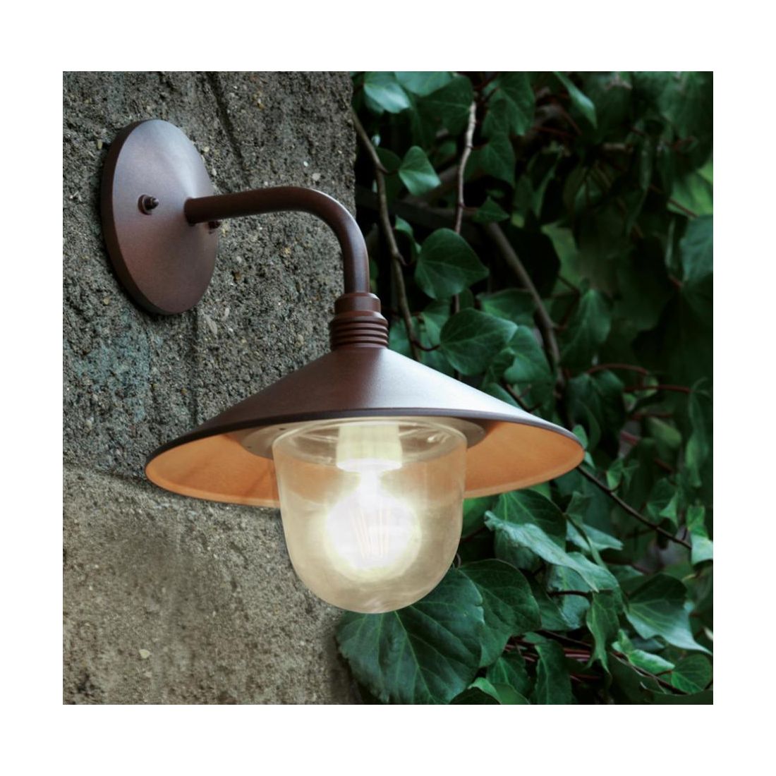 Lampada da parete rivolta verso il basso, dallo stile vintage, con struttura realizzata in alluminio pressofuso, studiata per l'arredamento di ambienti esterni dove è necessario valorizzare ciò che vi circonda.