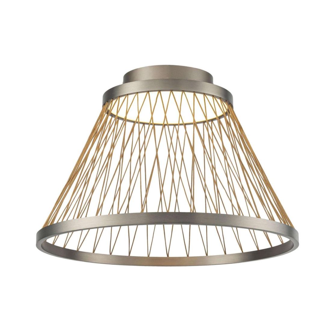 Plafoniera dal design moderno e dinamico che si distingue per le sue linee particolari, ideale per chi desidera un’illuminazione non convenzionale che, oltre a fornire luce, agisca anche come complemento d’arredo. Si presenta con una struttura realizzata in alluminio con finitura grigia ma il vero elemento distintivo di questa lampada è l'applicazione di cordoni decorativi in tessuto, proposti in tonalità oro, sapientemente intrecciati e disposti in modo dinamico attorno al corpo centrale; questo particolare gioco di fili crea un effetto scenografico che aggiunge movimento e personalità alla lampada.