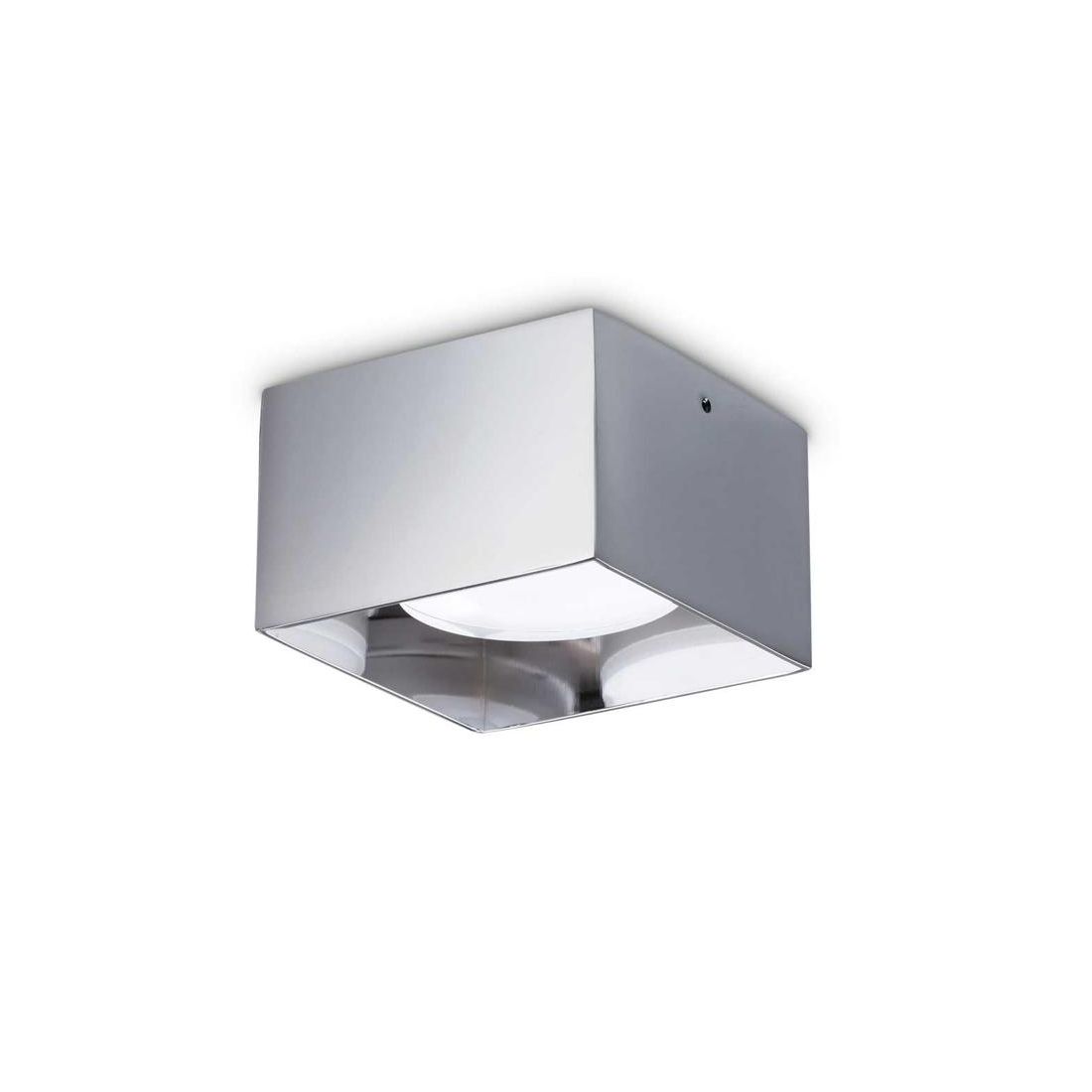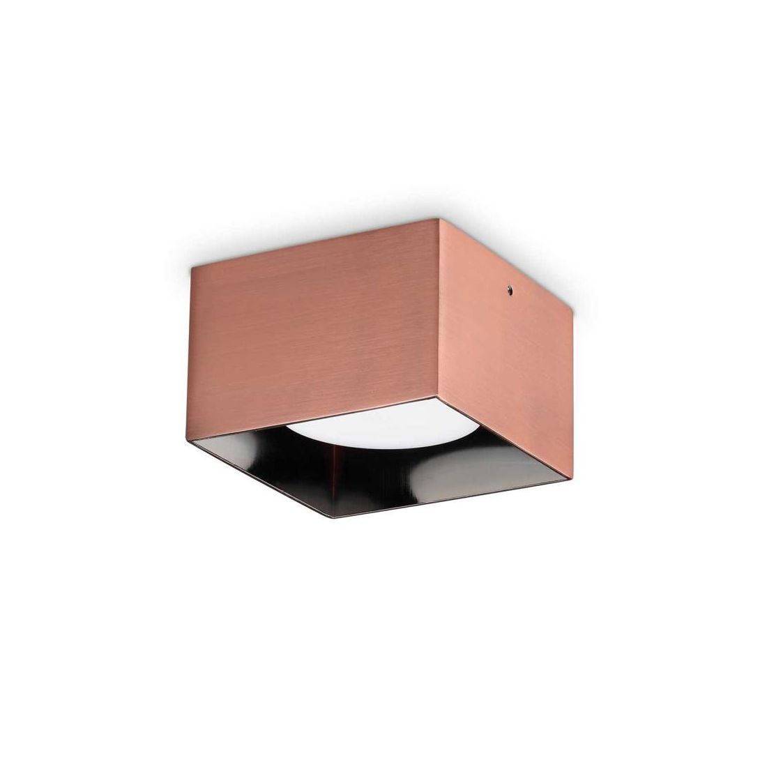 Faretto moderno per installazione a soffitto, con una forma quadrata di cm 10x10, realizzato interamente in metallo con finitura Rame, Cromo, Bianca, Nera oppure Ottone satinato (a vostra scelta) con il corpo che lascia la lampadina a vista senza penalizzazioni estetiche.