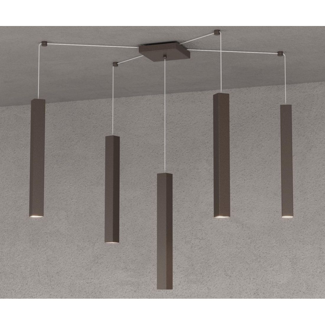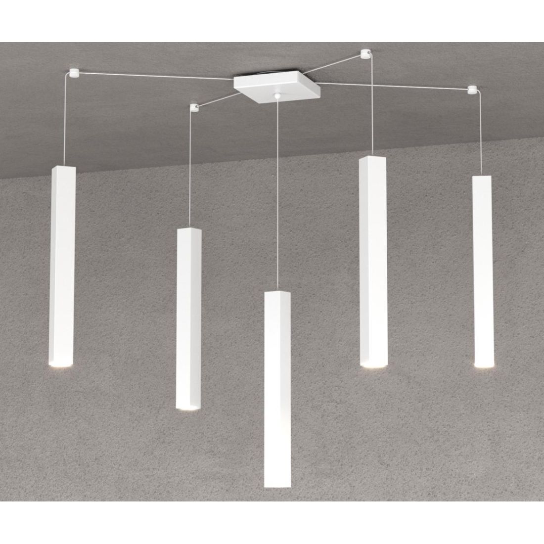 Lampadario a sospensione decentrato, dal design moderno, realizzato dal brand italiano Toplight, che si presenta con una basetta quadrata a soffitto e con 5 diffusori di forma squadrata ultrasottile, il tutto realizzato in metallo, che potrete posizionare a vostro piacimento sia in altezza che in larghezza grazie ai fili elettrici e ai tassetti in dotazione.