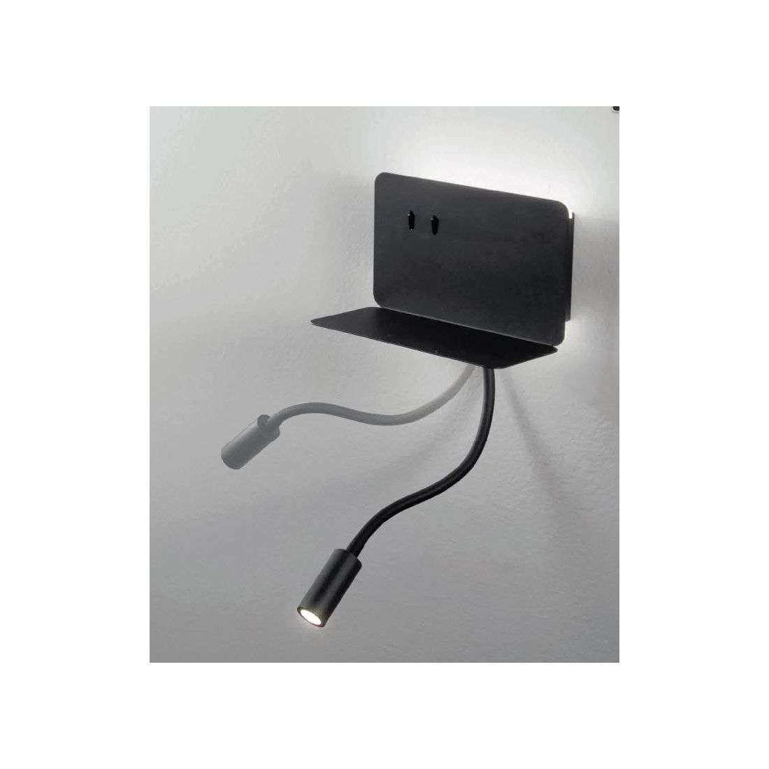 Applique da parete, ideale per il comodino della camera da letto, composta da una montatura in metallo verniciato Bianco oppure Nero (a vostra scelta) con un doppio diffusore: uno posto nella parte posteriore della struttura, che emette una luce indiretta sulla parete, e uno posto nello spot del braccetto flessibile e orientabile.
