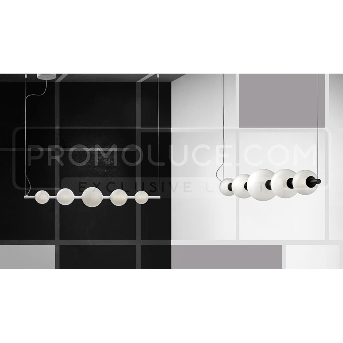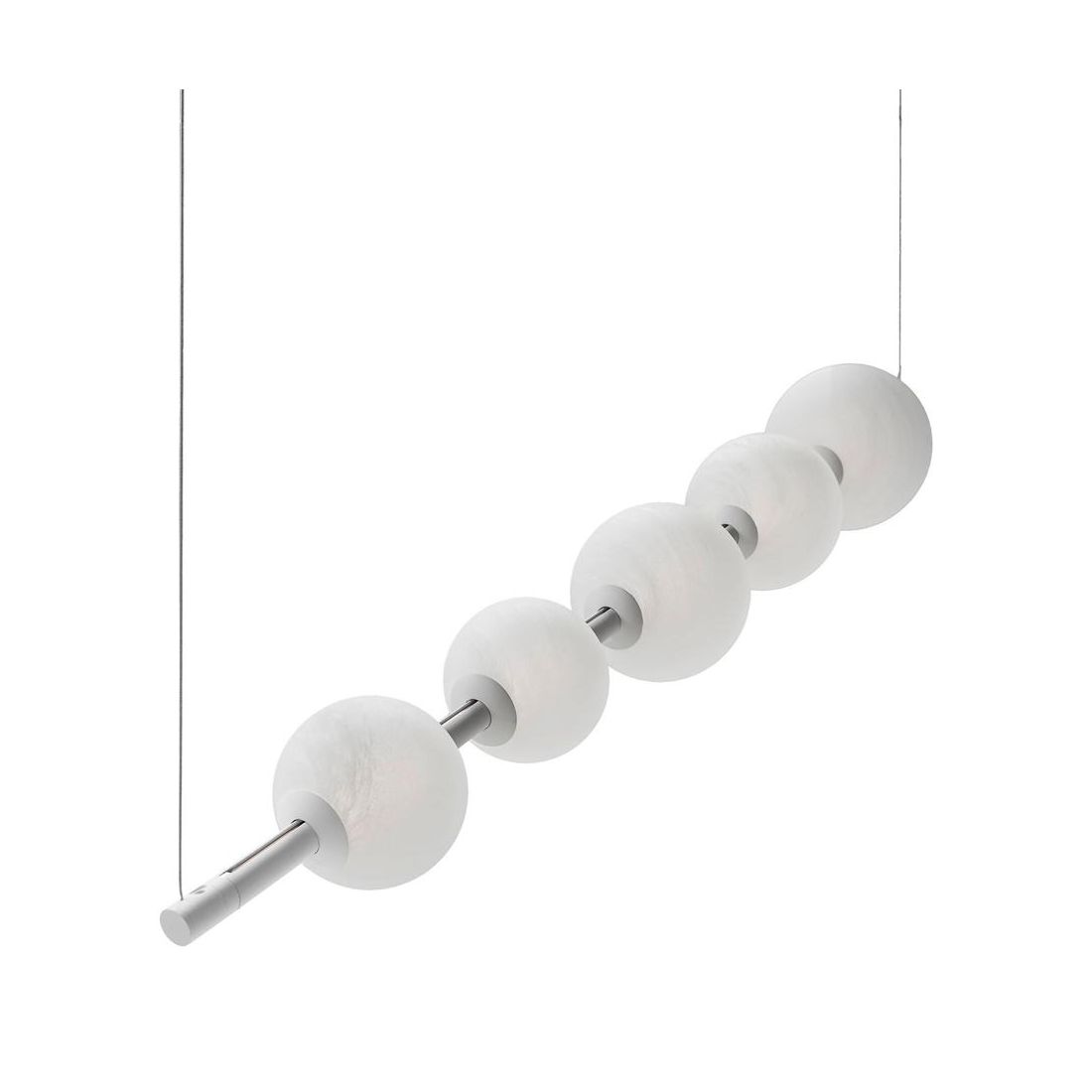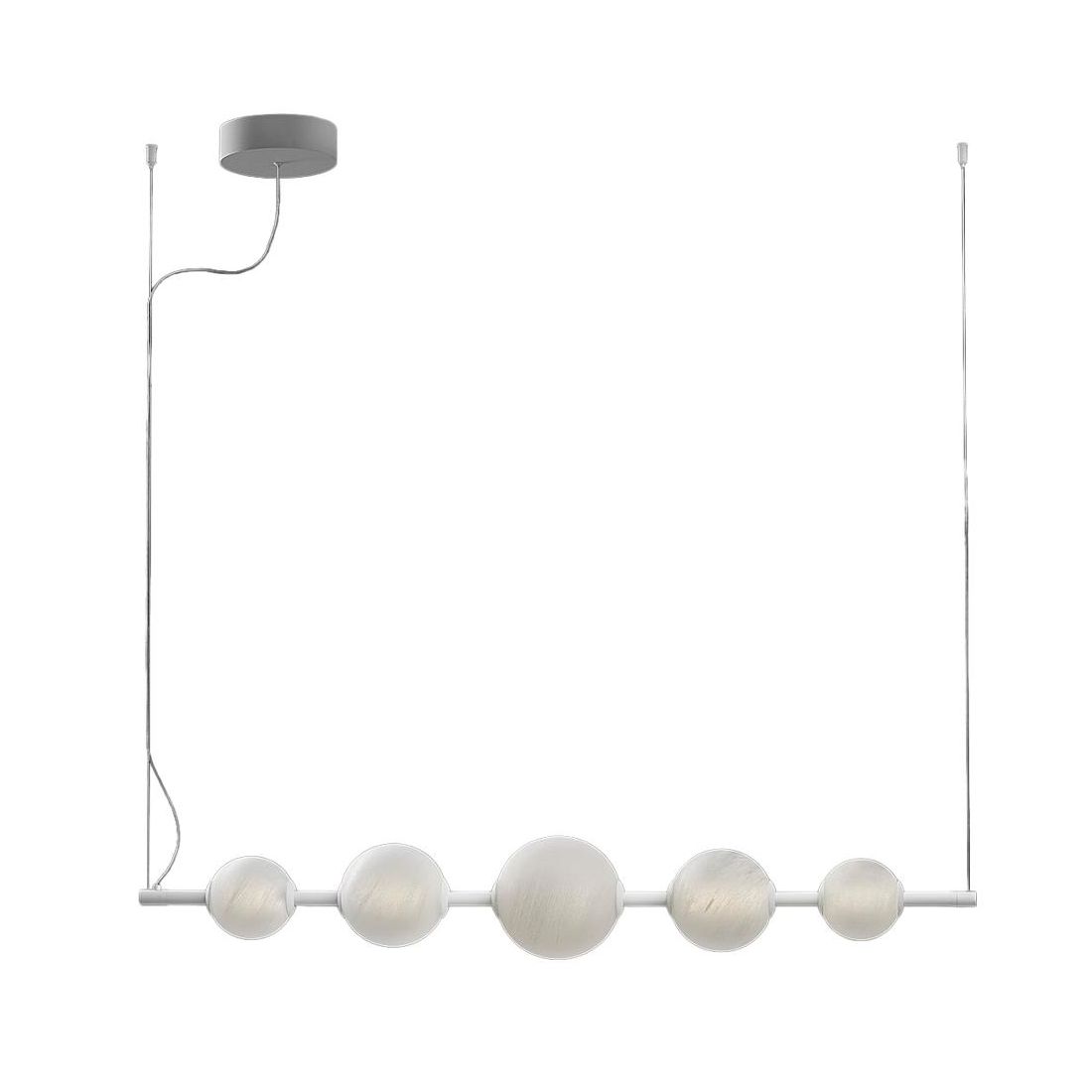 Sospensione lineare che si presenta con una struttura realizzata in alluminio verniciato Nero oppure Bianco (a vostra scelta) con i diffusori sferici in vetro con effetto alabastro le cui venature naturali donano un tocco di classicità eterna a una silhouette rigorosamente moderna.