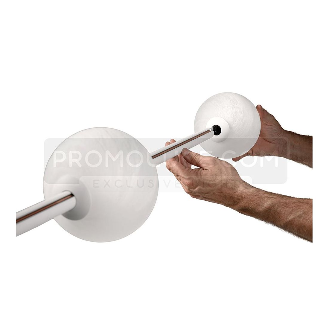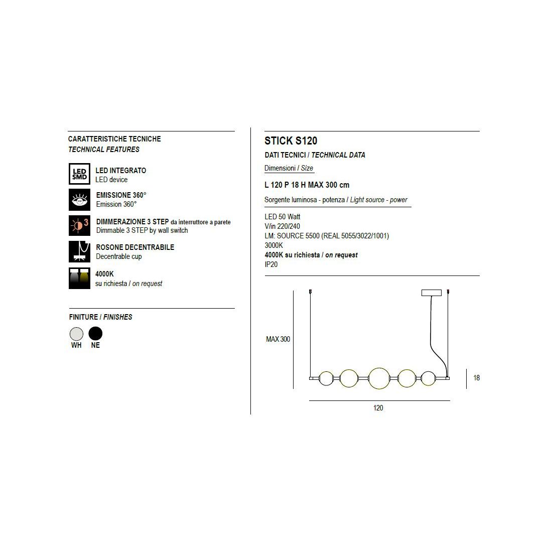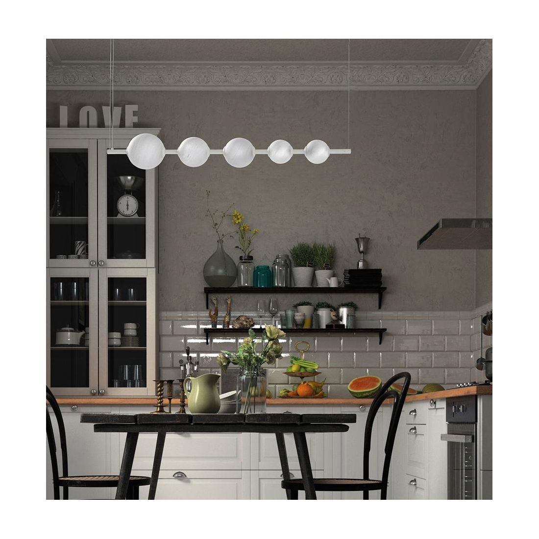 Sospensione lineare che si presenta con una struttura realizzata in alluminio verniciato Nero oppure Bianco (a vostra scelta) con i diffusori sferici in vetro con effetto alabastro le cui venature naturali donano un tocco di classicità eterna a una silhouette rigorosamente moderna.