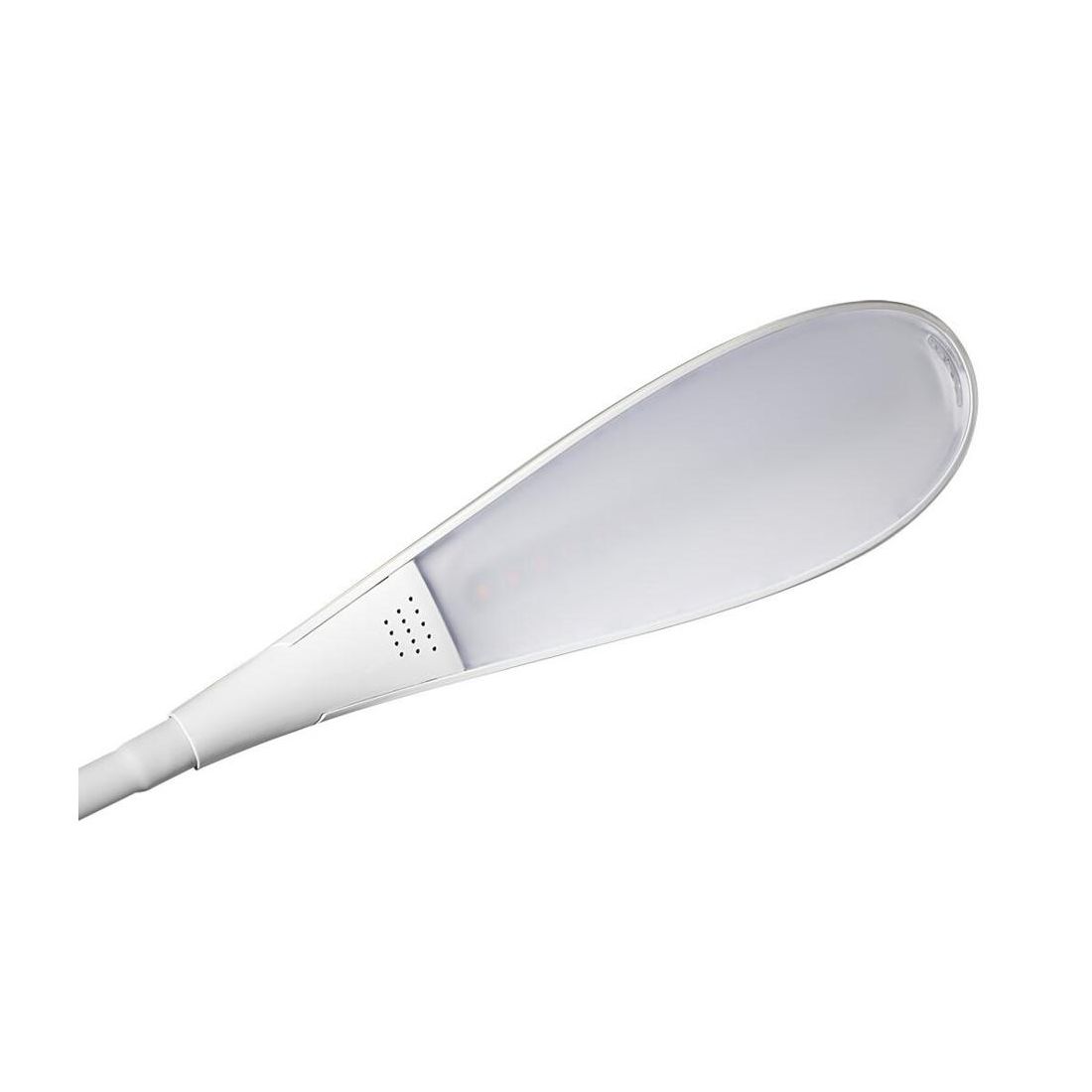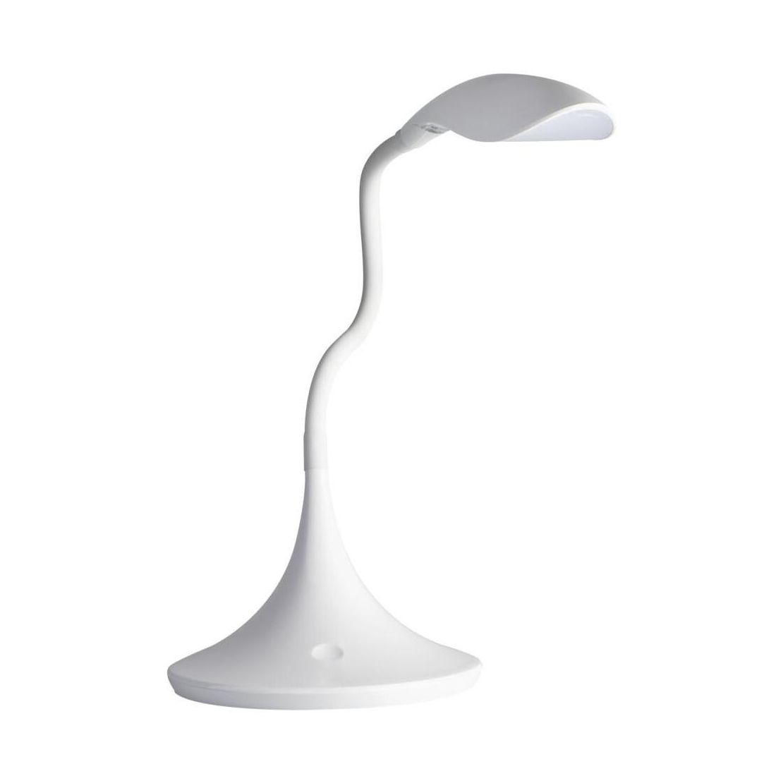 Lampada da tavolo in alluminio e gomma in silicone flessibile. I colori disponibili sono due bianco e nero. Il braccio flessibile permette di plasmare l'angolazione del diffusore per illuminare in maniera efficiente il tavolo di lavoro durante la scrittura o la lettura.