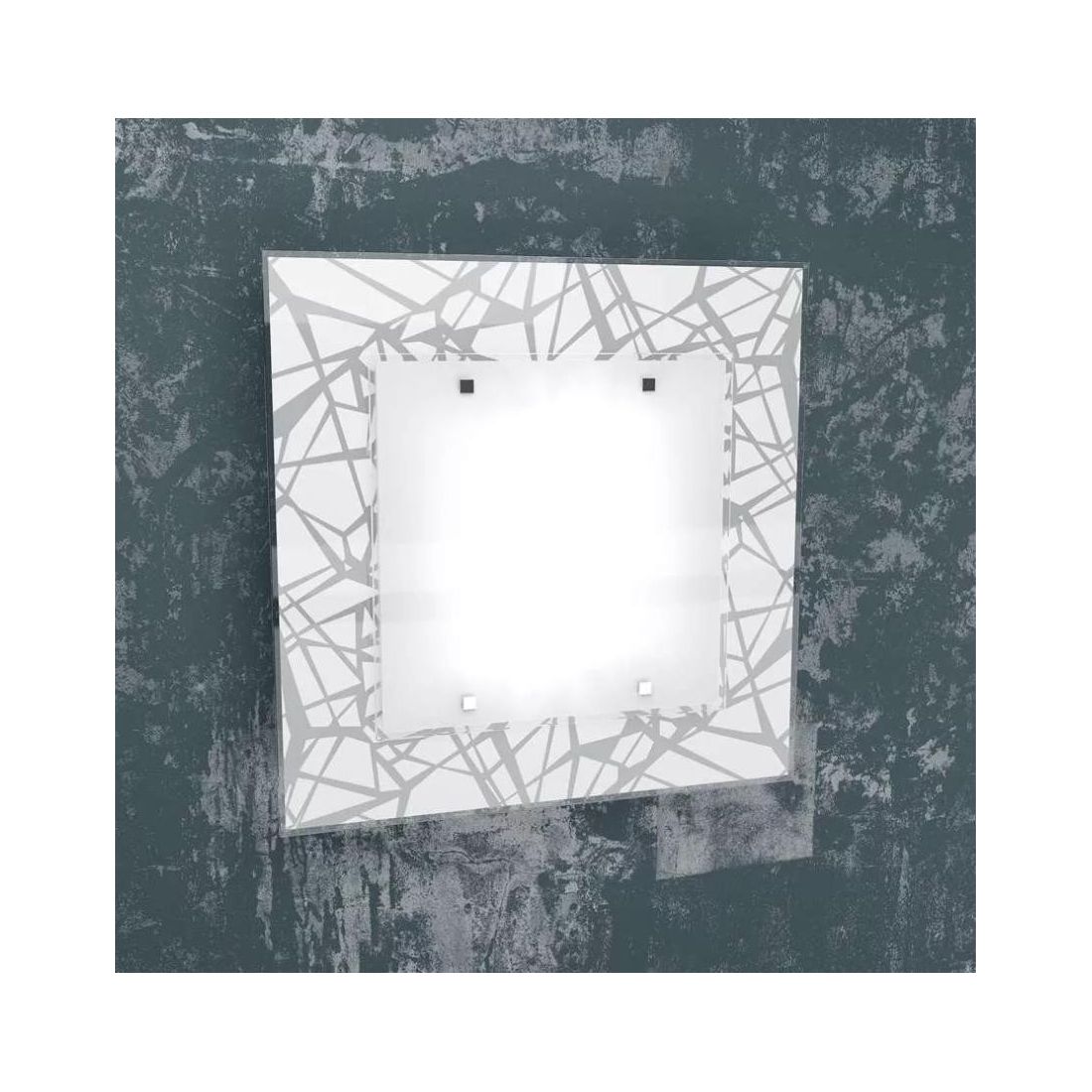 Una Lampada da soffitto dal design moderno che si presenta con la base in metallo bianco ed è composta da doppi diffusori realizzati in lastra di vetro extrachiaro con bordo trasparente; il vetro posteriore ha un decoro serigrafato satinato su fondo bianco che raffigura una texiture astratta mentre il vetro anteriore è serigrafato bianco, i piccoli bottoni quadrati per il fissaggio dei vetri sono in metallo cromato.