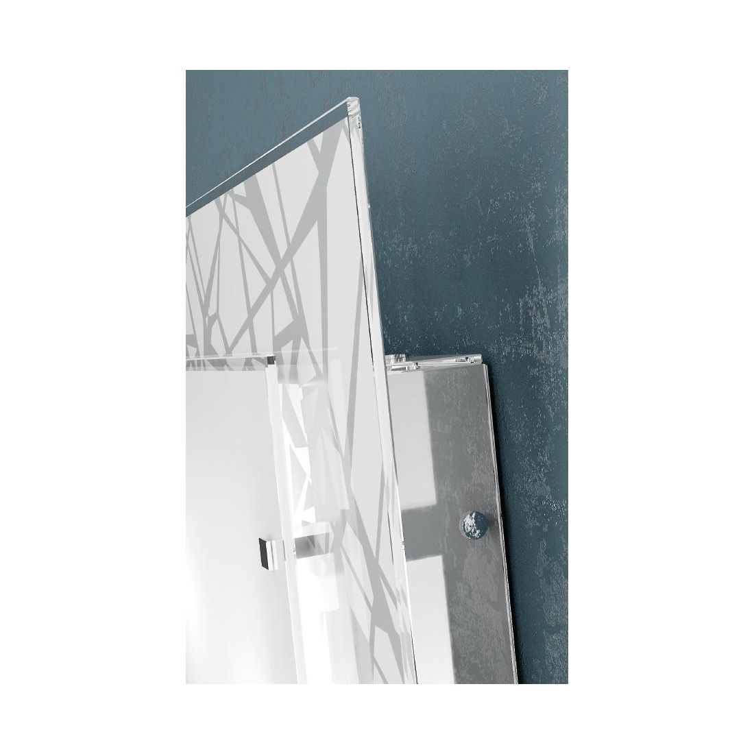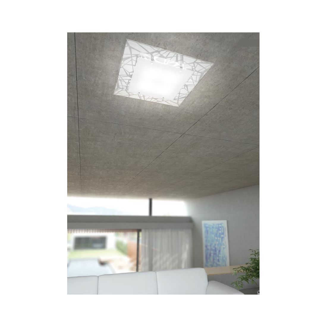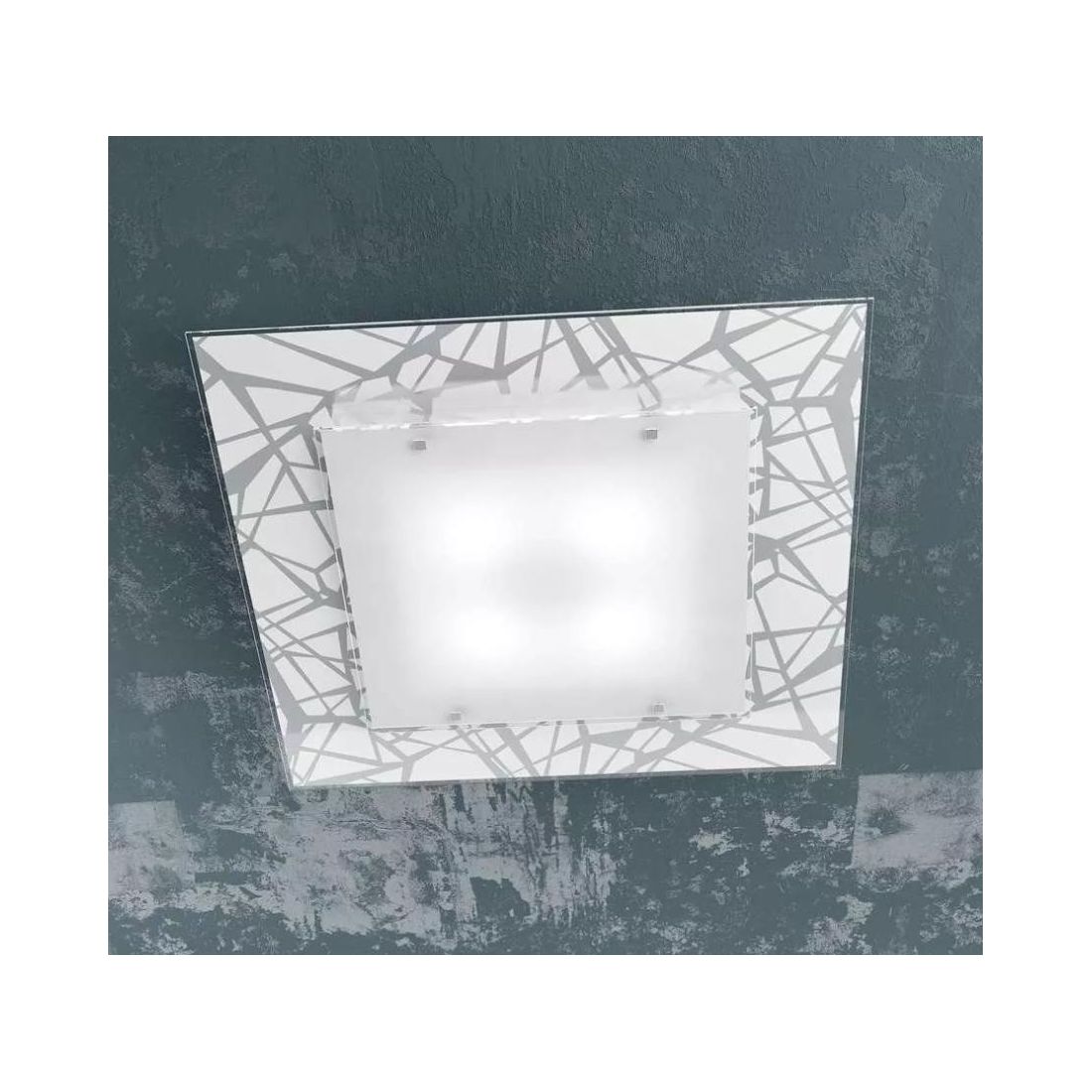 Una Lampada da soffitto dal design moderno che si presenta con la base in metallo bianco ed è composta da doppi diffusori realizzati in lastra di vetro extrachiaro con bordo trasparente; il vetro posteriore ha un decoro serigrafato satinato su fondo bianco che raffigura una texiture astratta mentre il vetro anteriore è serigrafato bianco, i piccoli bottoni quadrati per il fissaggio dei vetri sono in metallo cromato.