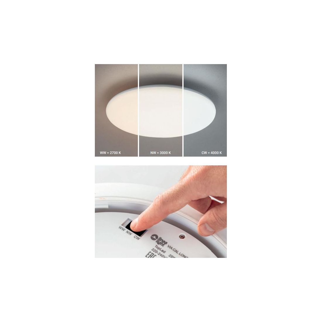 Lampada dotata di selettore manuale (Switch) per il controllo della temperatura colore, che si può scegliere nelle tre varianti: 2700K luce calda - 3000K bianca calda - 4000k bianca naturale (come potete vedere da foto); la sorgente luminosa LED da 12w, con distribuzione luminosa General Lighting, è composta da 1 LED topled con un CRI 80, il flusso luminoso della sorgente è di 1070 lm con luce 2700k, 1110 lm con luce 3000k oppure 1150 lm con luce 4000k, con un'efficienza nominale di 108.3 lm/W.