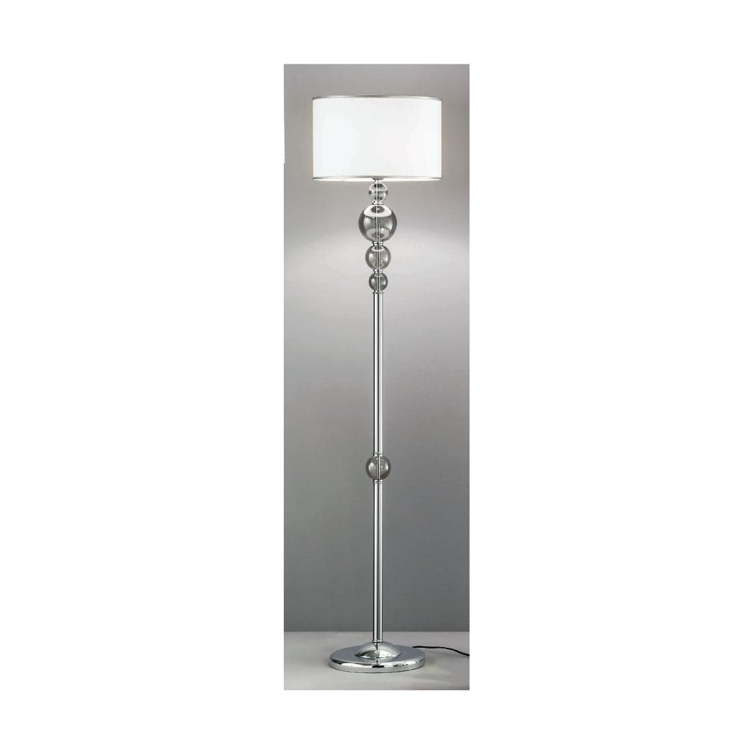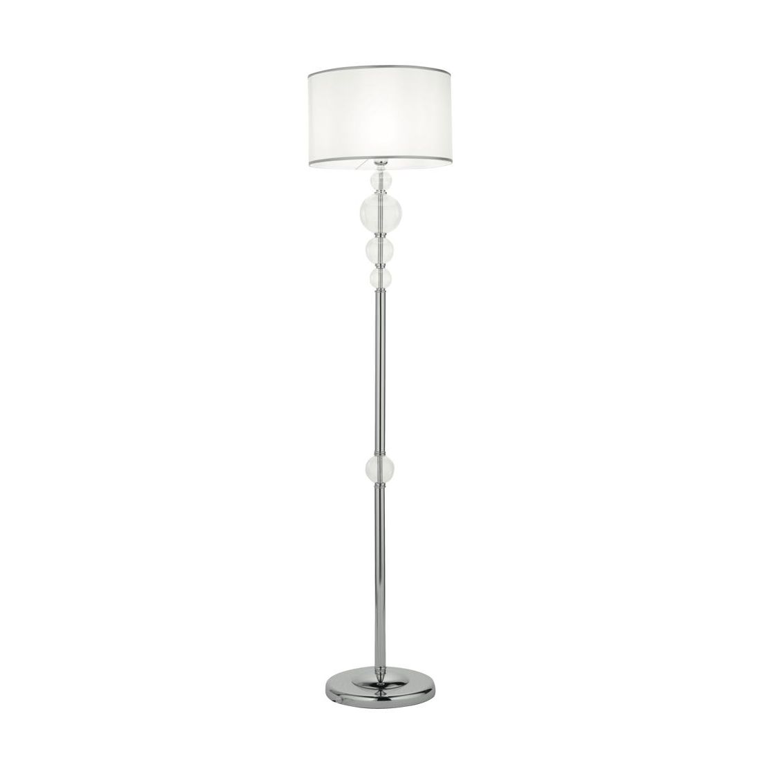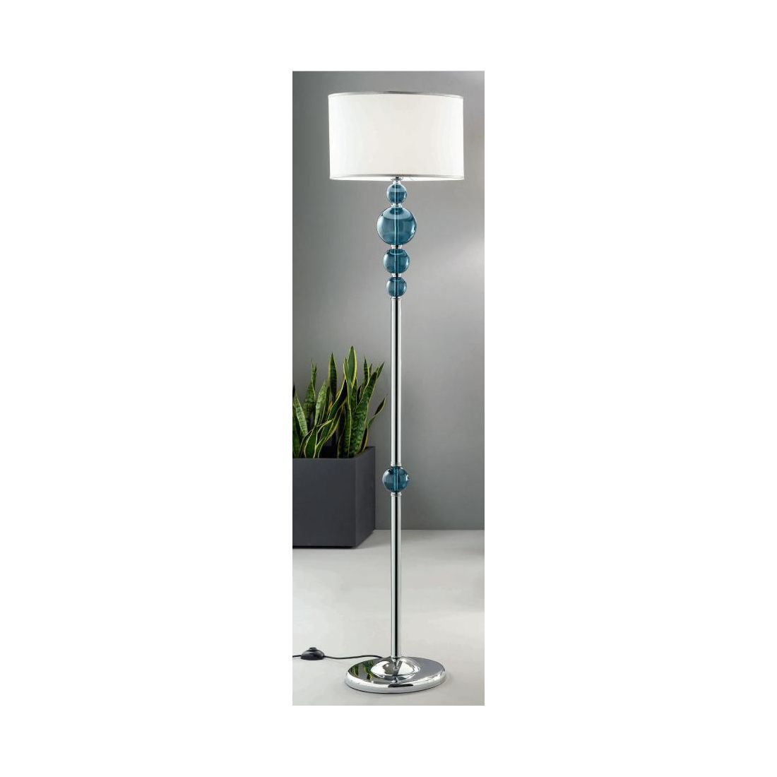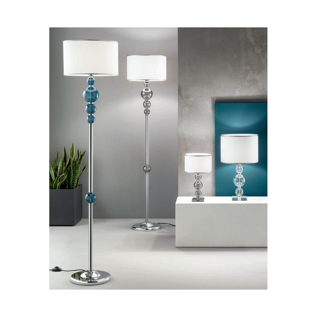 La piantana Tebe è composta dalla base rotonda e da una parte della struttura in metallo cromato oppure dorato; l'altra parte della struttura è impreziosita da sfere di vetro, lavorato a mano e dal paralume in tessuto.