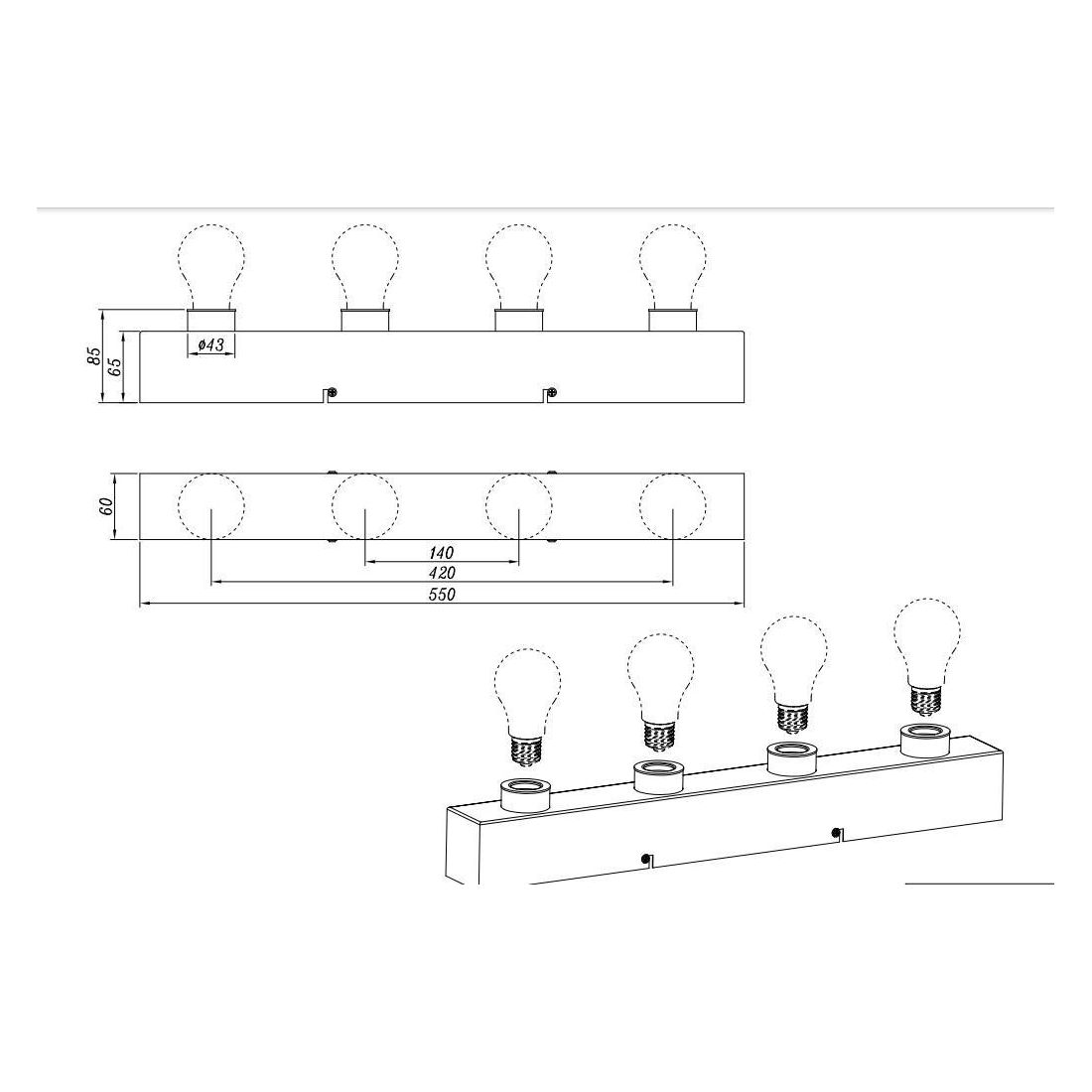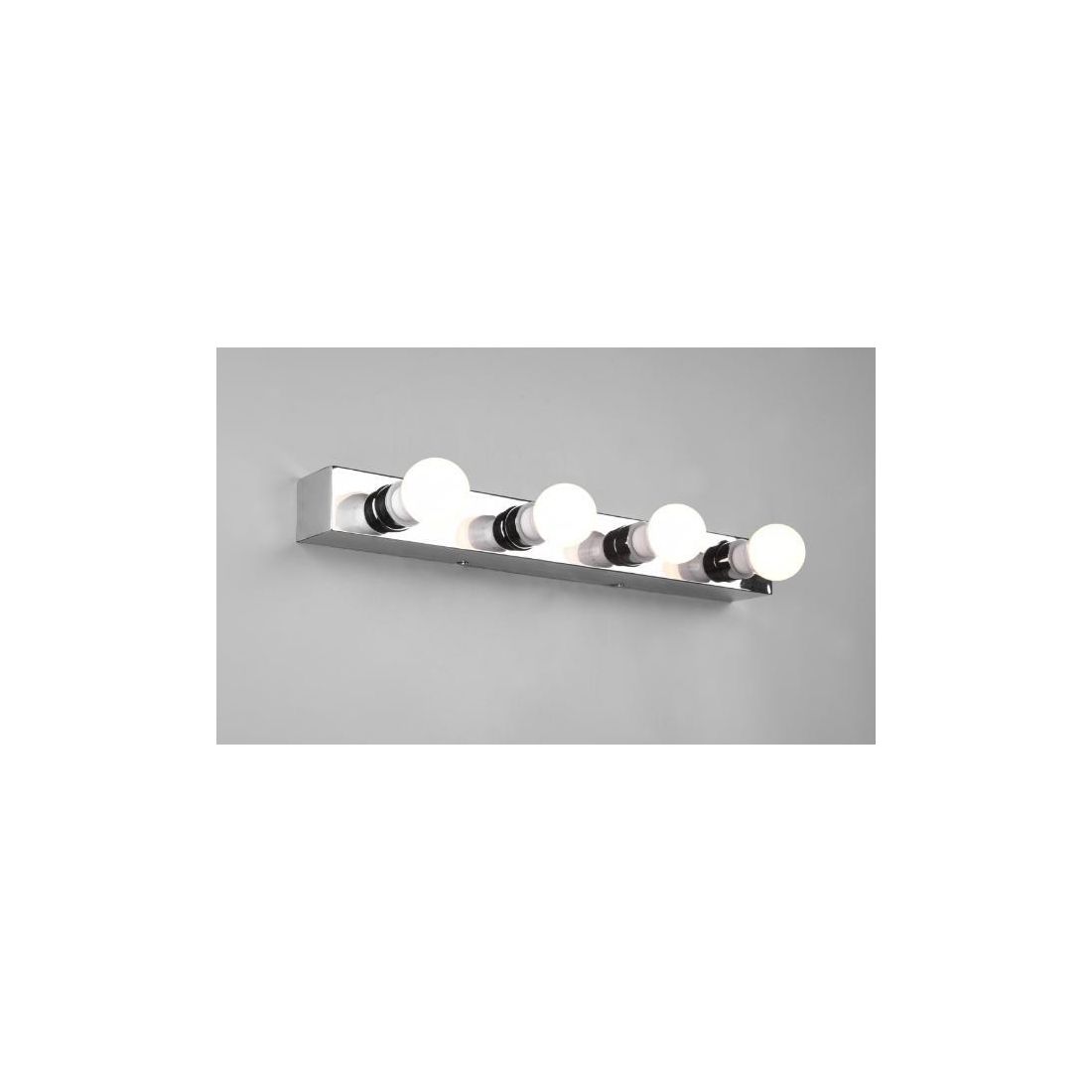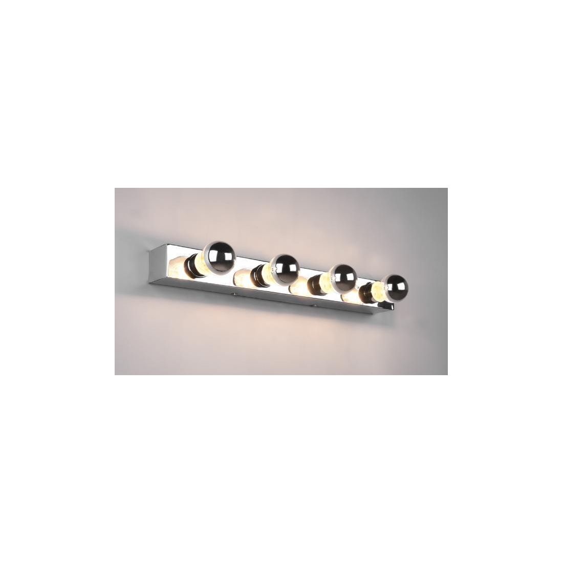 Lampada da specchio, dal design moderno, con una larghezza di cm 55, con una struttura rettangolare realizzata in metallo con finitura Cromo con 4 portalampade, attacco, E27, dove potete inserire qualsiasi lampadina a led, a basso consumo energetico, nel colore e nella potenza che più desiderate in base alle vostre esigenze di illuminazione.