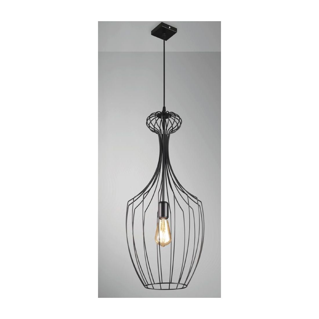 Lampadario a sospensione con una struttura a gabbia con un altezza di cm 77, interamente realizzata in metallo verniciato con finitura Nera che racchiude la sorgente luminosa; ha il cavetto regolabile in lunghezza in modo da poter posizionare il lampadario all'altezza che più vi necessita.