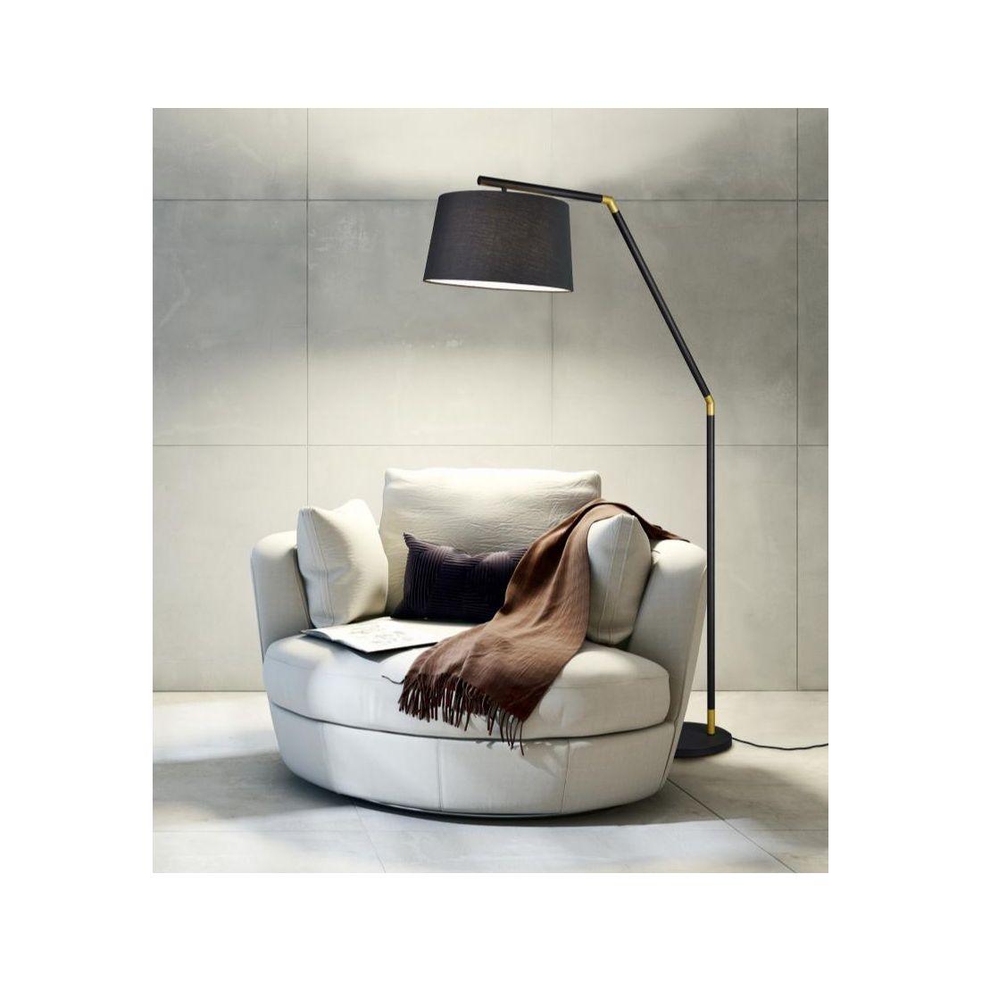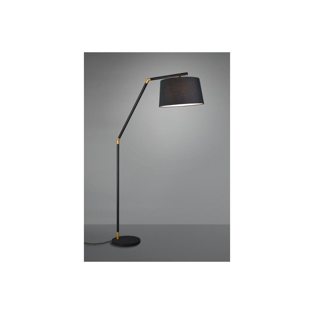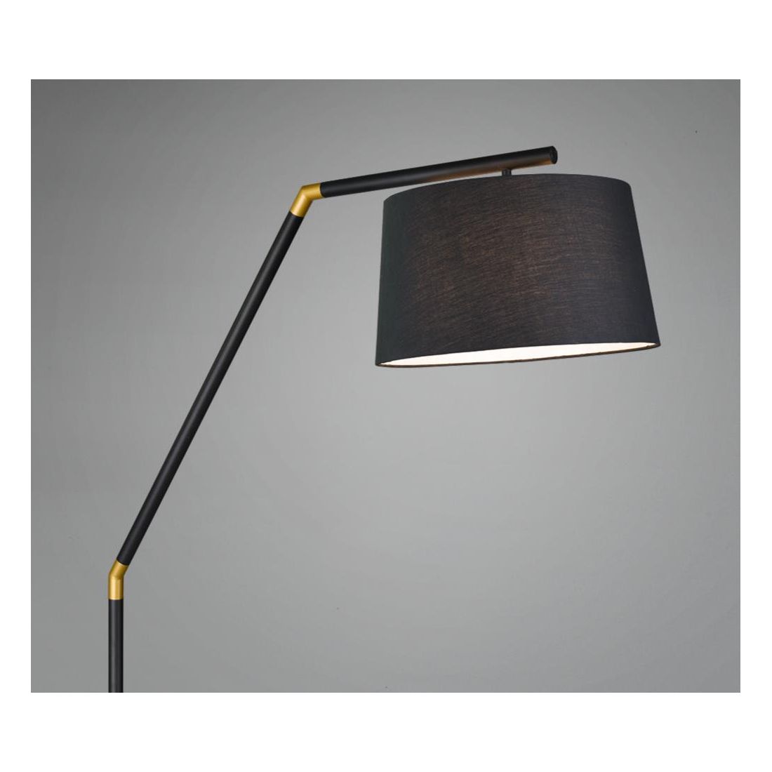 Una lampada da terra dal design moderno con una base a terra rotonda e con uno stelo in metallo verniciato Nero reclinato in due punti con inserti colore Oro; il paralume viene realizzato in tessuto, anch'esso Nero e questa piantana è dotata di interruttore on/off a pedale.