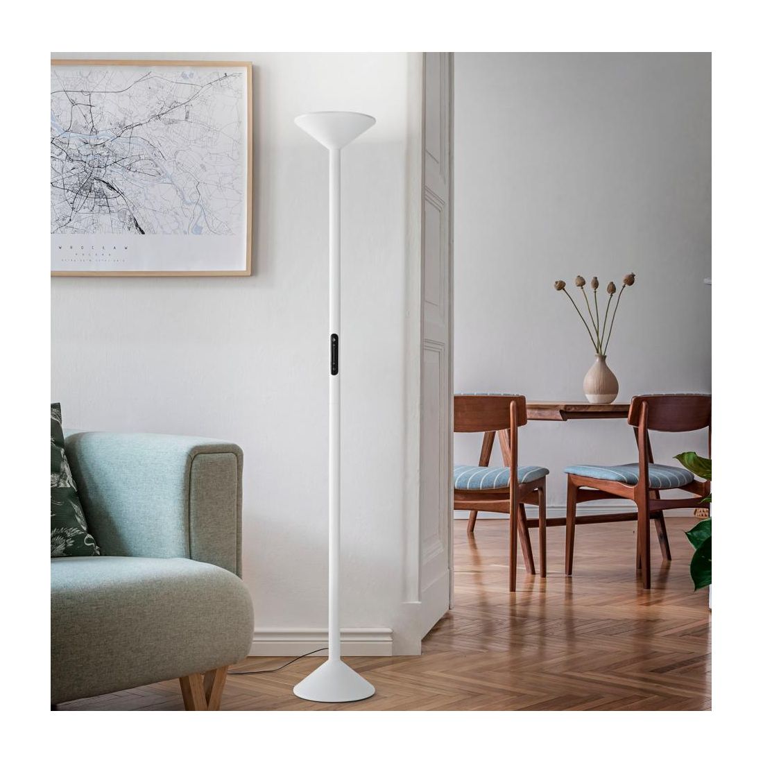 Questa lampada da terra unisce estetica minimalista a tecnologia all’avanguardia diventando un complemento d’arredo irrinunciabile per chi cerca eleganza e praticità. Il suo stile neutro si integra facilmente con arredi moderni, industriali o contemporanei trasformandola in una soluzione luminosa versatile e di classe.