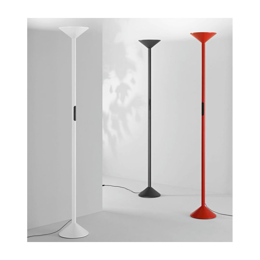 Piantana si distingue per il suo design essenziale e contemporaneo caratterizzata da forme geometriche pulite e una struttura snella che viene realizzata con uno stelo cilindrico in metallo disponibile in tre finiture: Rosso, Antracite o Bianco e con il diffusore conico in policarbonato bianco che completa l’estetica garantendo una diffusione uniforme della luce verso l’alto.
