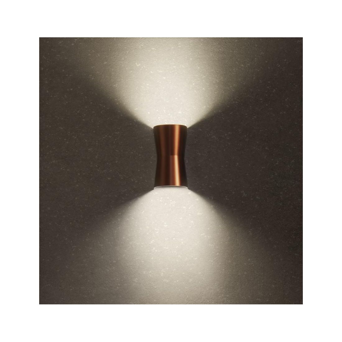 Lampada da parete ideata per ambienti esterni realizzata in policarbonato e ABS di colore Antracite o Rame (a vostra scelta) con due diffusori in policarbonato trasparente studiati per proiettare fasci luminosi sia rivolti verso l'alto sia verso il basso creando effetti raffinati e funzionali sulla parete.