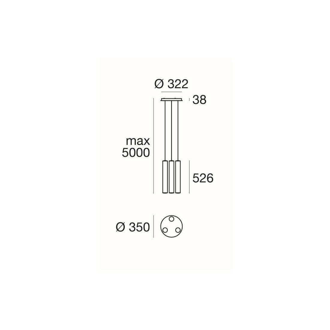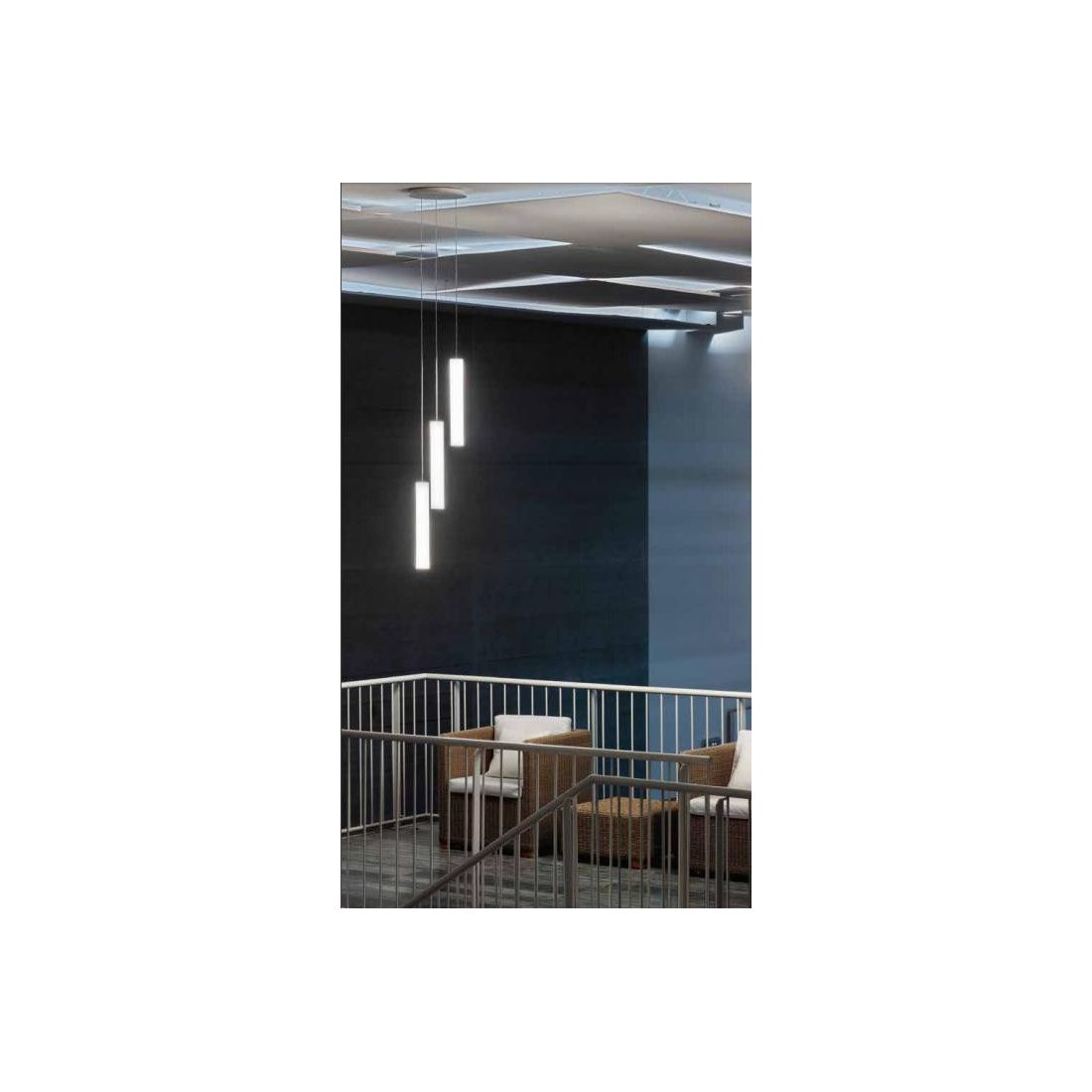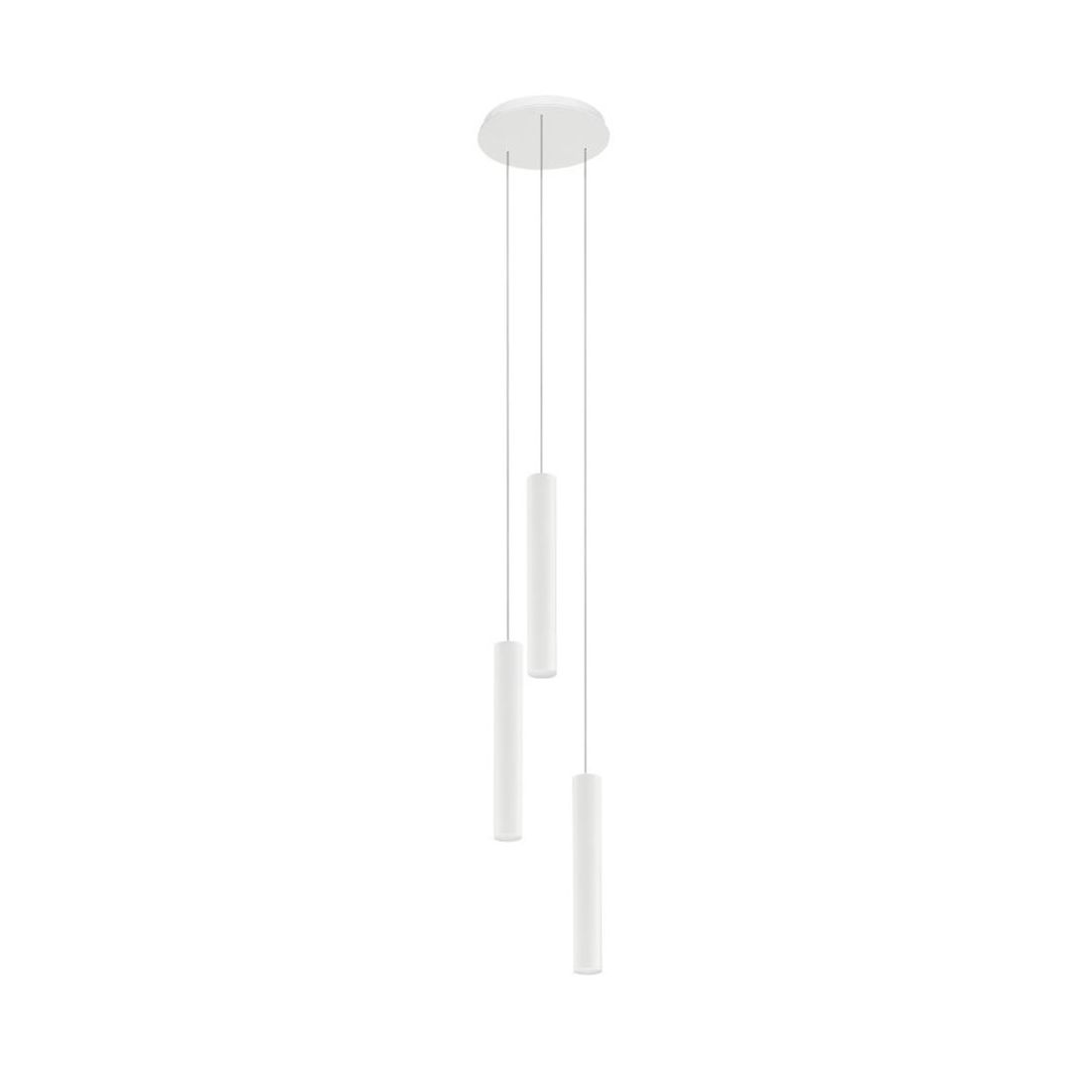Sospensione moderna dotata di tre diffusori di forma cilindrica realizzati in polietilene naturale chiusi alle estremità da tappi in alluminio verniciati di Bianco goffrato così come il rosone a soffitto; la sua luce viene diffusa in maniera omogenea nell'ambiente creando un effetto decorativo particolare; i cavi sono regolabili in lunghezza in modo da poter posizionare i punti luce dove più desiderate o dove più necessitano.