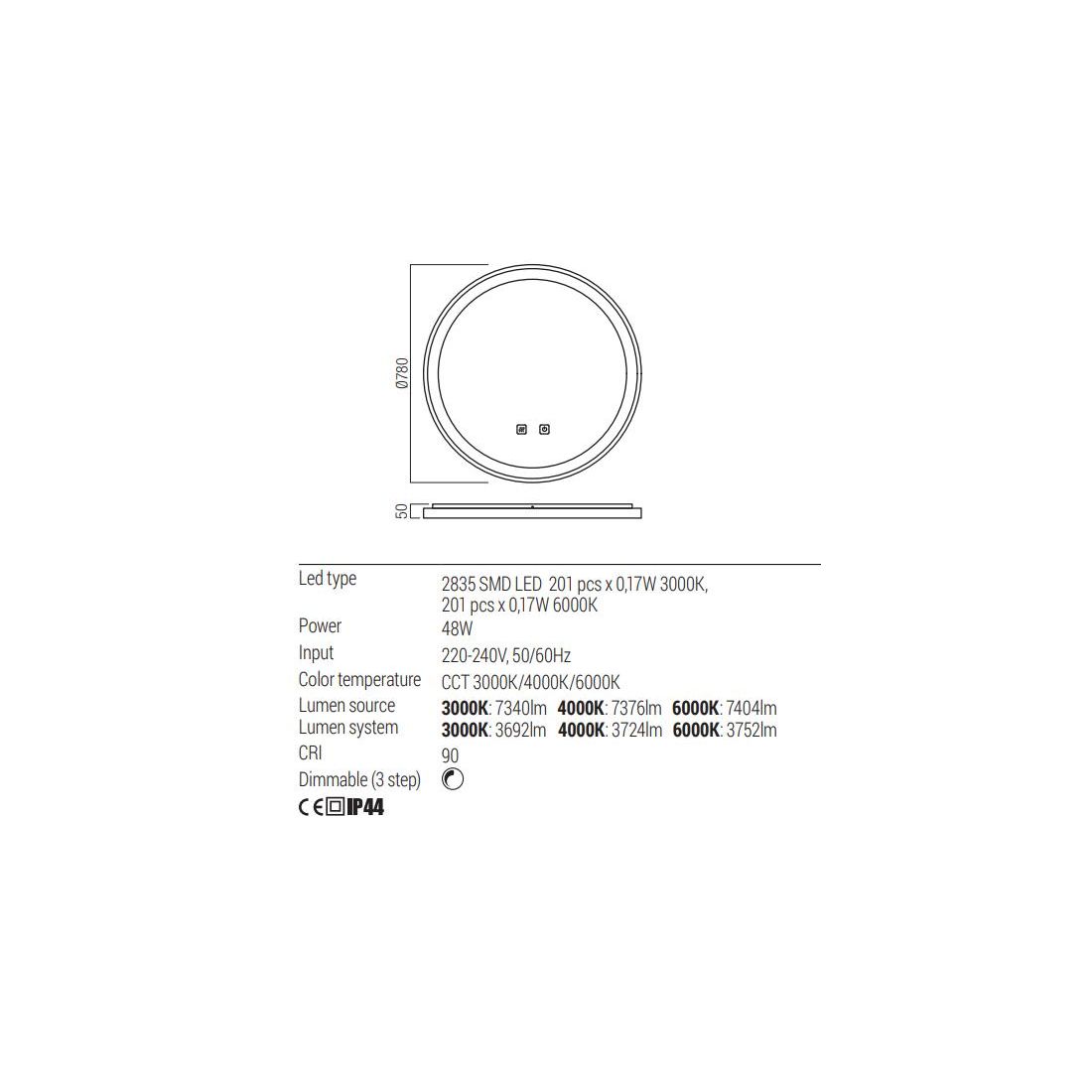 Questo specchio integra una sorgente luminosa a Led da 48w ed è munita di pulsante CCT che consente di selezionare il colore della luce, in qualsiasi momento, scegliendo tra una tonalità bianca calda (3000K), una luce bianca naturale (4000K) oppure una luce fredda (6000K). E' dotata di funzione Dimmer che vi permette di regolare l’intensità luminosa in tre step, attraverso un semplice interruttore a parete, garantendo il massimo comfort visivo in ogni momento.